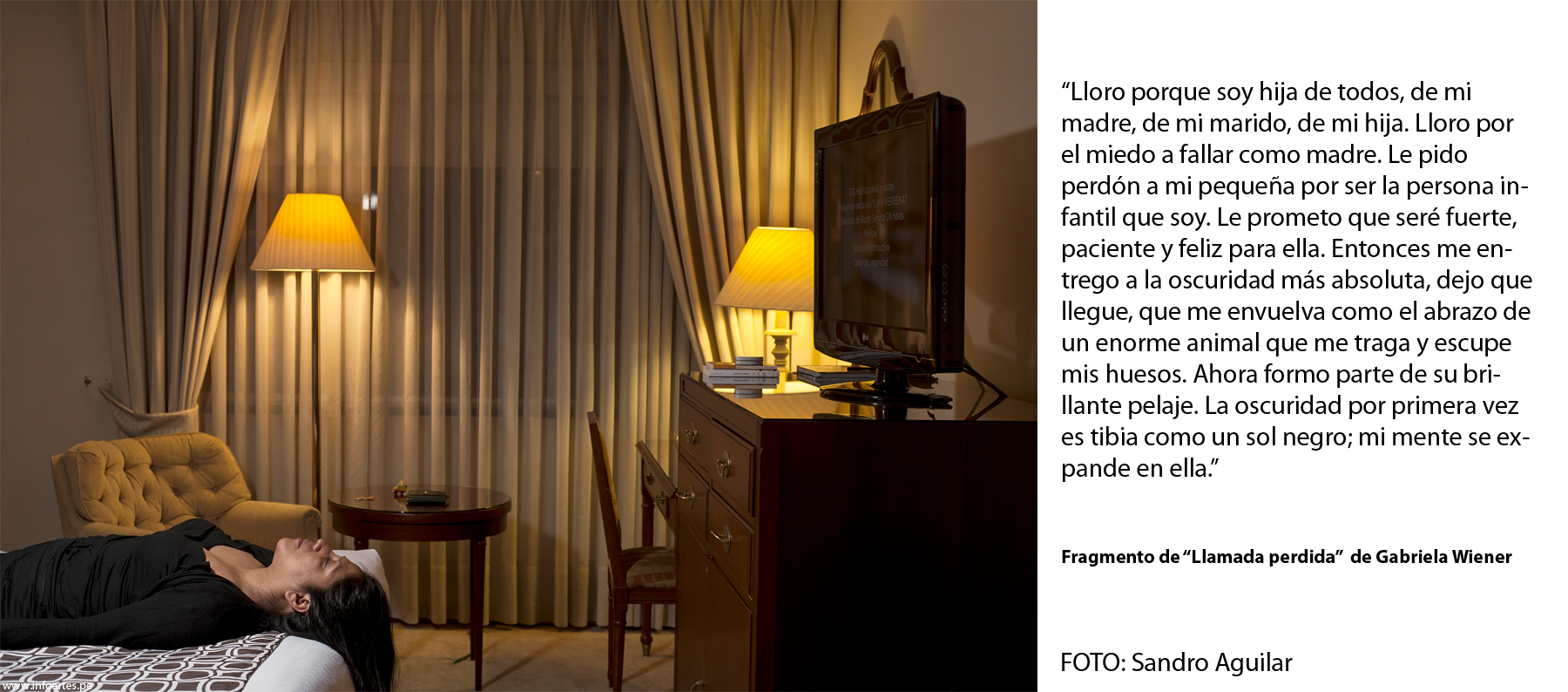 Este trabajo se realizó entre las múltiples actividades que los escritores cumplieron en Bogotá, por acierto pero sobre todo por mucha intuición y aventura, ya que les agradezco que hayan puesto tan buena disposición para mis pedidos disparatados. A Carlos Yushimito, por ejemplo, lo llevé al helipuerto del hotel Tequendama a sabiendas de su connotado vértigo. A Diego Trelles lo convertí en presidiario de un pabellón en la Cárcel Distrital de Bogotá. A Abelardo Sánchez-León, conocido también como nadador, lo convertí en un ocasional salvavidas de una piscina (recuerdo que nos echaron pronto porque una pareja reclamó su intimidad a los besos). A Gabriela Wiener la hice dormir porque estaba cansada y me hacía muchas preguntas. A Raúl Tola y Grecia Cáceres los puse en observación de dos vigilantes para darles un contrapunto suspicaz, o solo ajeno, y es que eso documentaría también a una ciudad que sugiere cuidado. A Alejando Neyra lo fotografié en Lima porque no encajamos en Bogotá, a pesar de ya tener la idea hecha durante un almuerzo de la Feria. Me pregunto qué hubiese sido de esa foto con los muchachos militares que una noche nos pidieron cigarrillos a Dante Trujillo y a mí. A Oswaldo Reynoso lo encontré antes de que vuelva a Lima pero no quería salir del hotel, así que el vestíbulo lo envió quieto a la Amazonía virgen. Puedo decir, sin duda, que ellos fueron sus mejores actores, y me enseñaron mucho aquellos inolvidables días. ¡Feliz día internacional del libro 2015!