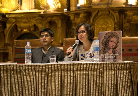 Raúl Montero Quispe y Ananda Cohen Suarez en presentación del libro en la capilla del Hotel Monasterio en Cusco el 23 de octubre de 2015.