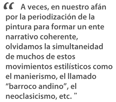 La organización del libro permite una mirada de la transformación de la estética cusqueña a través de las vicisitudes de la época colonial, empezando con un estilo más manierista y académico durante el siglo XVII, transitando a una expresión más popular e idiosincrática en el siglo XVIII e inicios del XIX. Pero aún más importante, nos hemos dado cuenta de la diversidad estilística e iconográfica de la pintura colonial cusqueña; estamos enfrentados por un cuerpo de imágenes marcado por su eclecticismo, mostrándonos los diferentes gustos y preferencias entre los mecenas del arte durante el período colonial. A veces, en nuestro afán por la periodización de la pintura para formar un ente narrativo coherente, olvidamos la simultaneidad de muchos de estos movimientos estilísticos como el manierismo, el llamado “barroco andino”, el neoclasicismo, etc.