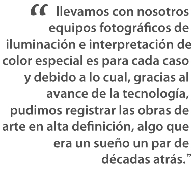 Cuando nos propusimos realizar el libro "Pintura Colonial Cusqueña", unos de nuestros objetivos principales fue reproducir las obras de arte lo más fielmente posible y que, a diferencia de muchas investigaciones publicadas sobre la pintura colonial, las imágenes sean las estrellas del estudio. Más de 158 imágenes casi a página completa convierten este libro en una especie de catálogo de un museo virtual de la pintura en los Andes del sur peruano. Es en este contexto donde la fotografía se convirtió en la piedra angular de nuestra investigación, dejando de ser mero instrumento comunicativo para convertirse en una evidencia del estado de la obra de arte. Por tal motivo, llevamos con nosotros equipos fotográficos de iluminación e interpretación de color especiales para cada caso y debido a lo cual, gracias al avance de la tecnología, pudimos registrar las obras de arte en alta definición, algo que era un sueño un par de décadas atrás.