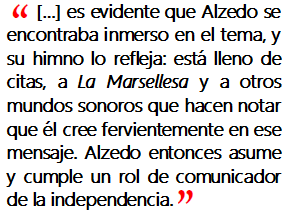 El compromiso de Alzedo se refleja en su música, ya que escribió varias piezas relacionadas a la independencia. Esto es bien importante porque nos hace entender que su himno, lo que hoy en día es el Himno Nacional del Perú, en realidad fue originalmente una marcha patriótica de Lima. Es así de específica, y como marcha patriótica, era una más de las canciones que hizo por la independencia. Es bien interesante lo que sucede con esta pieza convertida finalmente en Himno Nacional, si tenemos en cuenta que por ejemplo el himno de Argentina lo compuso Blas Parera, que era un músico del teatro que no tenía ningún interés por la causa independentista. En cambio es evidente que Alzedo se encontraba inmerso en el tema, y su himno lo refleja: está lleno de citas, a La Marsellesa y a otros mundos sonoros que hacen notar que él cree fervientemente en ese mensaje. Alzedo entonces asume y cumple un rol de comunicador de la independencia.
