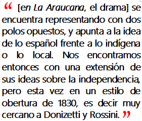 Yo no creo que La Araucana se compusiera para una ópera que él planificara, o algo similar. En realidad es una obertura temática, una obertura de carácter como se llamaría en la época. Alzedo creía mucho en la idea operática de la obertura, y que ésta debía presentar –en sus temas y en carácter– una especie de resumen de la historia, o bien la esencia de un drama. Aquí este último se encuentra representando con dos polos opuestos, y apunta a la idea de lo español frente a lo indígena o lo local. Nos encontramos entonces con una extensión de sus ideas sobre la independencia, pero esta vez en un estilo de obertura de 1830, es decir muy cercano a Donizetti y Rossini. Una pieza de mucho interés, justamente porque refleja una época de influencias operáticas sobre la música latinoamericana.