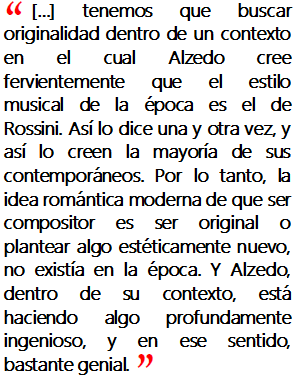 Pero buscar una idea de originalidad no tiene tanto sentido para la época, porque ¿qué es lo que espera Alzedo como mulato, como americano, etc? Lo que espera es afirmar que él es parte del mundo de la música global. Él dice en su Filosofía elemental que la música tiene varios campos de estilos, y justamente menciona un estilo contemporáneo, que consiste en hacer música que suene como parte de lo que hacen todos los demás compositores de su tiempo. Y para él, el estilo contemporáneo es el de Rossini. Por eso hace música en estilo Rossini, aunque articulándolo sobre sus propios discursos e intereses.