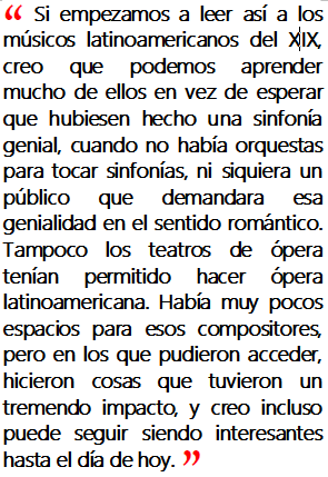 Si empezamos a leer así a los músicos latinoamericanos del XIX, creo que podemos aprender mucho de ellos en vez de esperar que hubiesen hecho una sinfonía genial, cuando no había orquestas para tocar sinfonías, ni siquiera un público que demandara esa genialidad en el sentido romántico. Tampoco los teatros de ópera tenían permitido hacer ópera latinoamericana. Había muy pocos espacios para esos compositores, pero en los que pudieron acceder, hicieron cosas que tuvieron un tremendo impacto, y creo incluso puede seguir siendo interesantes hasta el día de hoy.