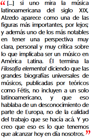 Él termina la Filosofía elemental diciendo que las grandes biografías universales de músicos, publicadas por teóricos como Fétis, no incluyen a un solo latinoamericano, y que eso hablaba de un desconocimiento de parte de Europa, no de la calidad del trabajo que se hacía acá. Y yo creo que eso es lo que tenemos que alcanzar hoy en día nosotros. Alzedo no habla de la calidad de la música en América Latina, dice que nuestra academia tenía una conceptualización muy europea de la música, y que alineados a las expectativas de otro continente, tendíamos a pensar que la música buena se hacía sólo allá. Y en realidad en la práctica no, la música que se hacía en América Latina era la que se tenía que hacer acá, era la que servía para la gente de acá, y por eso Alzedo fue tan respetado no sólo en su país sino también en los países circundantes, y hoy en día por todos los expertos en música clásica latinoamericana.