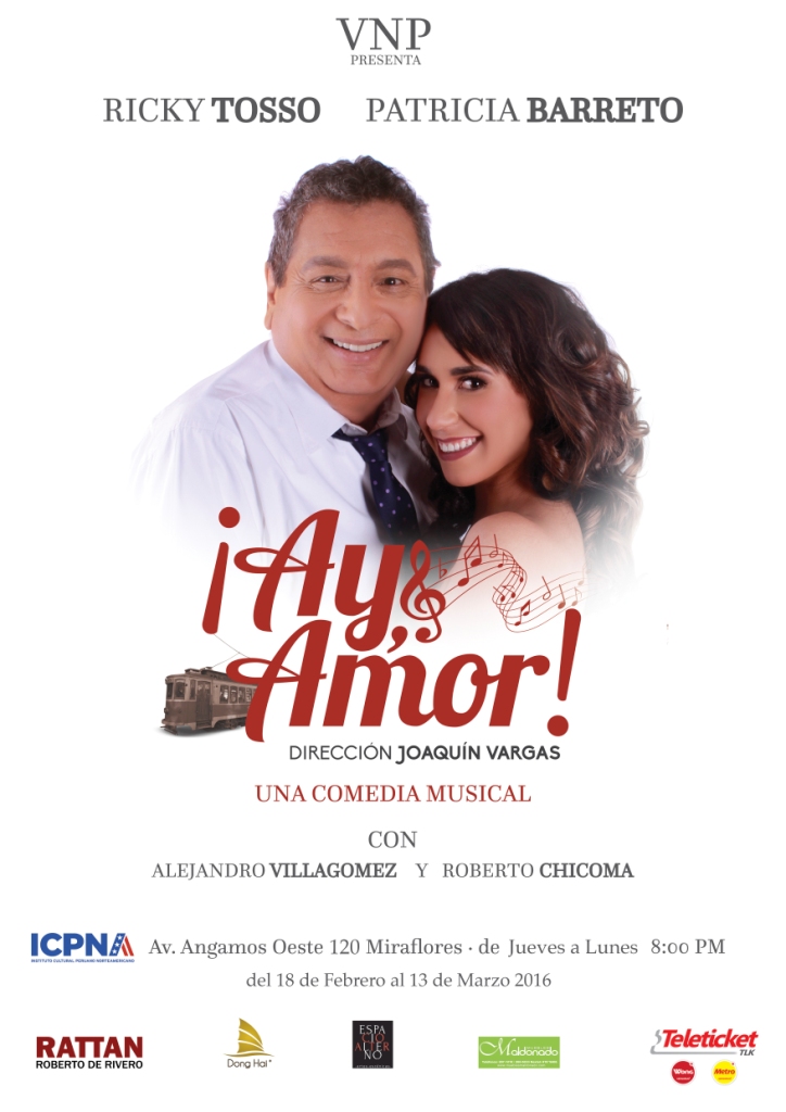 Por una corta temporada el reconocido productor y director teatral Joaquín Vargas presentará la comedia musical titulada ¡AY, AMOR! con la participación de Patricia Barreto y Ricky Tosso en el Auditorio ICPNA Miraflores. El estreno se realizará el jueves 18 de febrero a las 20 horas. Obra va hasta el 13 de marzo en el ICPNA de Miraflores.