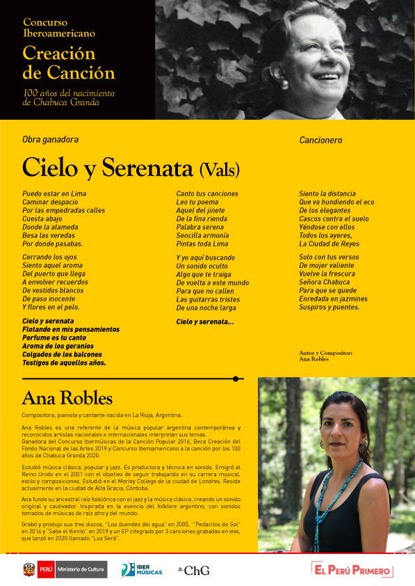 Estreno del tema ganador del “Concurso Iberoamericano 100 años del nacimiento de Chabuca Granda: Creación de Canción”, organizado por el programa Ibermúsicas y el Ministerio de Cultura. La canción "Cielo y serenata", compuesta por la artista argentina Ana Robles, será estrenada en una versión producida por el Ballet Folclórico Nacional del Perú, desde el Gran Teatro Nacional.