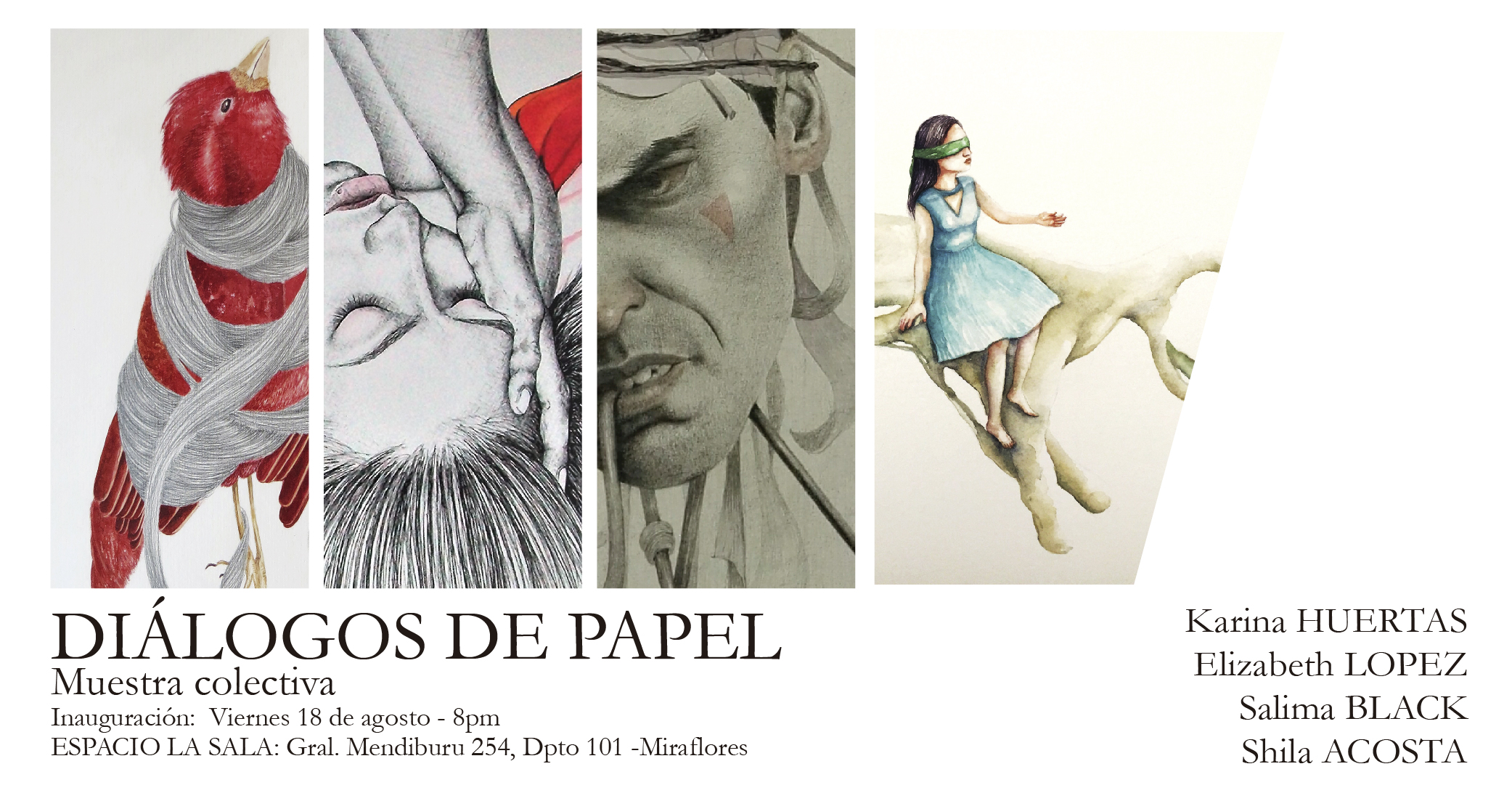 La casa Espacio La Sala se complace en presentar "DIALOGOS DE PAPEL” Muestra colectiva de las artistas Elizabeth López, Shila Acosta, Salima Black y Karina Huertas e invitarlos a la inauguración a realizarse la noche del viernes 18 de agosto a las 8pm en Mendiburu 254 Miraflores.