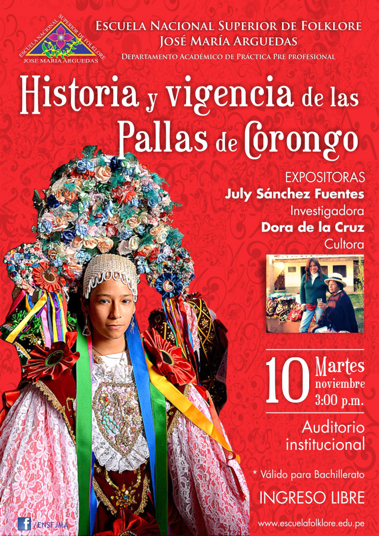 La Escuela Nacional Superior del Folklore José María Arguedas los invita a la exposición HISTORIA Y VIGENCIA DE LAS PALLAS DE CORONGO a realizarse el próximo martes 10 de noviembre a las 3:00 p.m. en el auditorio de la institución. EL INGRESO ES LIBRE