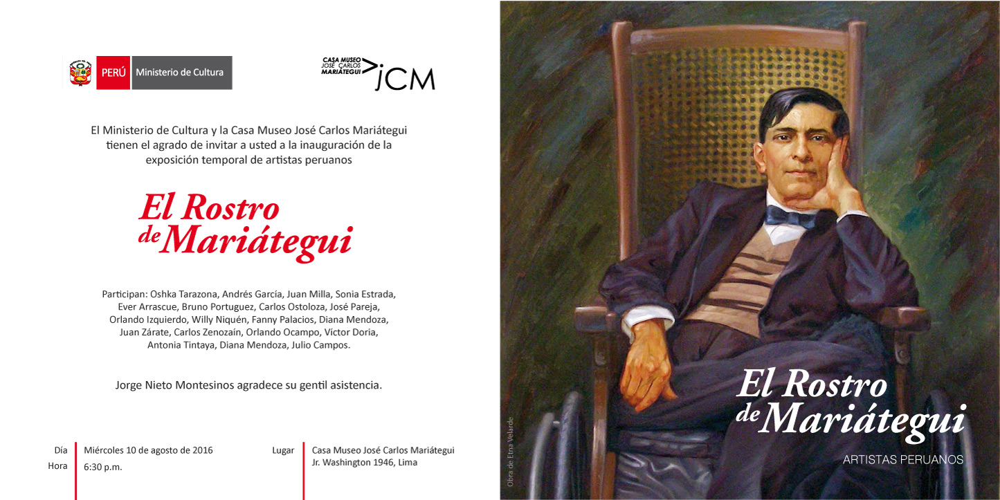 El Ministerio de Cultura y la Casa Museo José Carlos Mariátegui tienen el agrado de invitar a usted a la inauguración de la exposición temporal de artistas peruanos "El rostro de Mariatégui" en la que participan Oshka Tarazona, Andrés García, Juan Milla, Sonia Estrada, Ever Arrascue, Bruno Portuguez, Carlos Osotoloza, José Pareja, Orlando Izquierdo, Willy Niquén, Fanny Palacios, Diana Mendoza, Juan Zárate, Carlos Zenozaín, Orlando Ocampo, Victor Doria, Antonia Tintaya, Diana Mnedoza y Julio Campos.