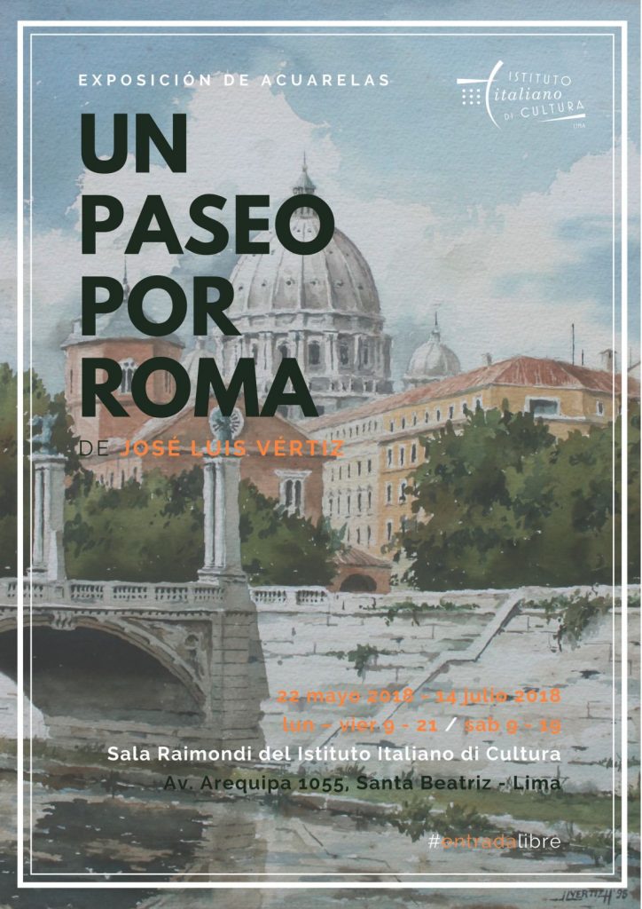 La exposición de acuarelas "Un paseo por Roma" se presenta este martes 22 de mayo, a las 19:30 h. en la Sala Raimondi del Instituto Italiano de Cultura.Esta exposición, del artista José Luis Vértiz estará abierta al público hasta el 14 de julio.