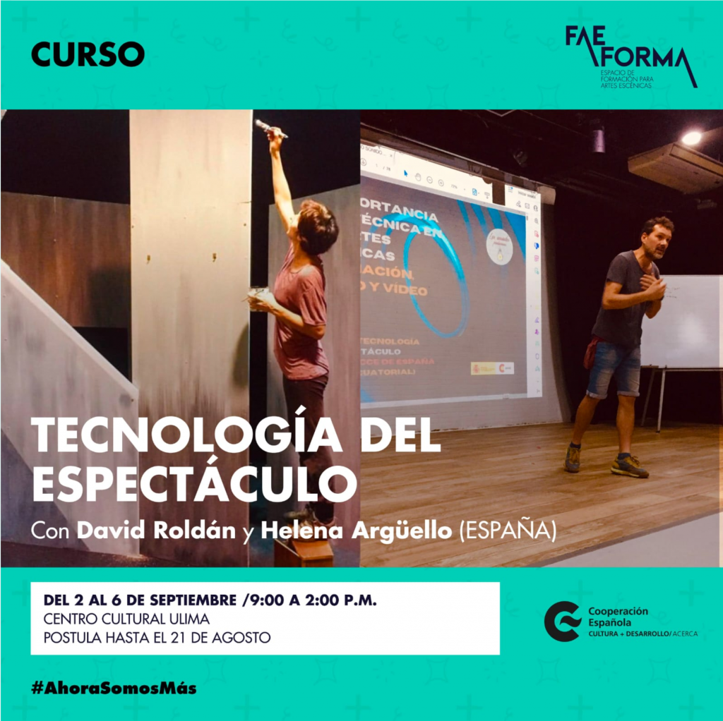 El Festival de Artes Escénicas de Lima 2024, presentado por el Ministerio de Cultura del Perú, lanza en el marco del FAE FORMA, la convocatoria para el curso presencial “Tecnología del espectáculo” dirigido por David Roldán y Helena Argüello (España).