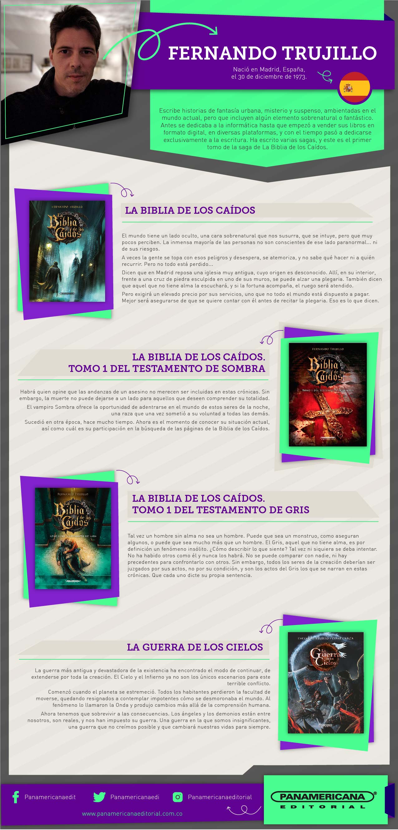 - El escritor español Fernando Trujillo Sanz, autor de bestsellers digitales, presentará La Biblia de los Caídos. Tomo 1 del Testamento del Gris publicado por la Editorial Panamericana.
