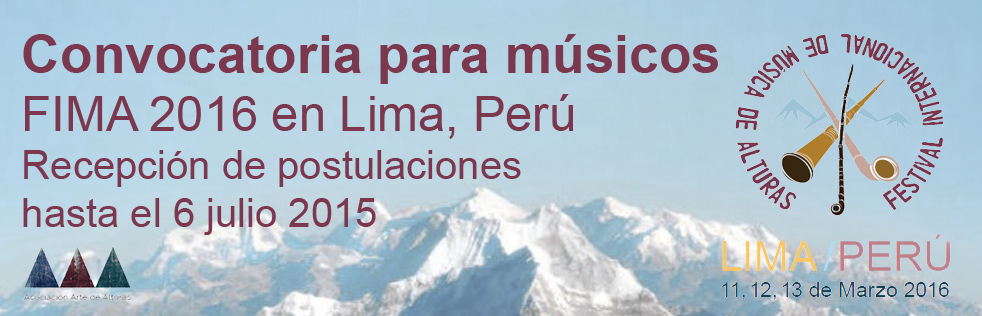 La Asociación Arte de Alturas convoca a los músicos, solistas y grupos, de los países andinos a participar en el Segundo Festival Internacional de Música de Alturas (FIMA), que se realizará en Lima el 11, 12, y 13 de marzo del 2016. La convocatoria, que estará abierta del 6 de abril al 6 de julio, incluye voz, todos los géneros musicales propios de cada país o región, composiciones inéditas y conocidas, así como todos los instrumentos musicales que se escuchan y tocan en los países andinos. Las solicitudes deberán enviarse en formato Word a la siguiente dirección: convocatoria@festivaldealturas.pe