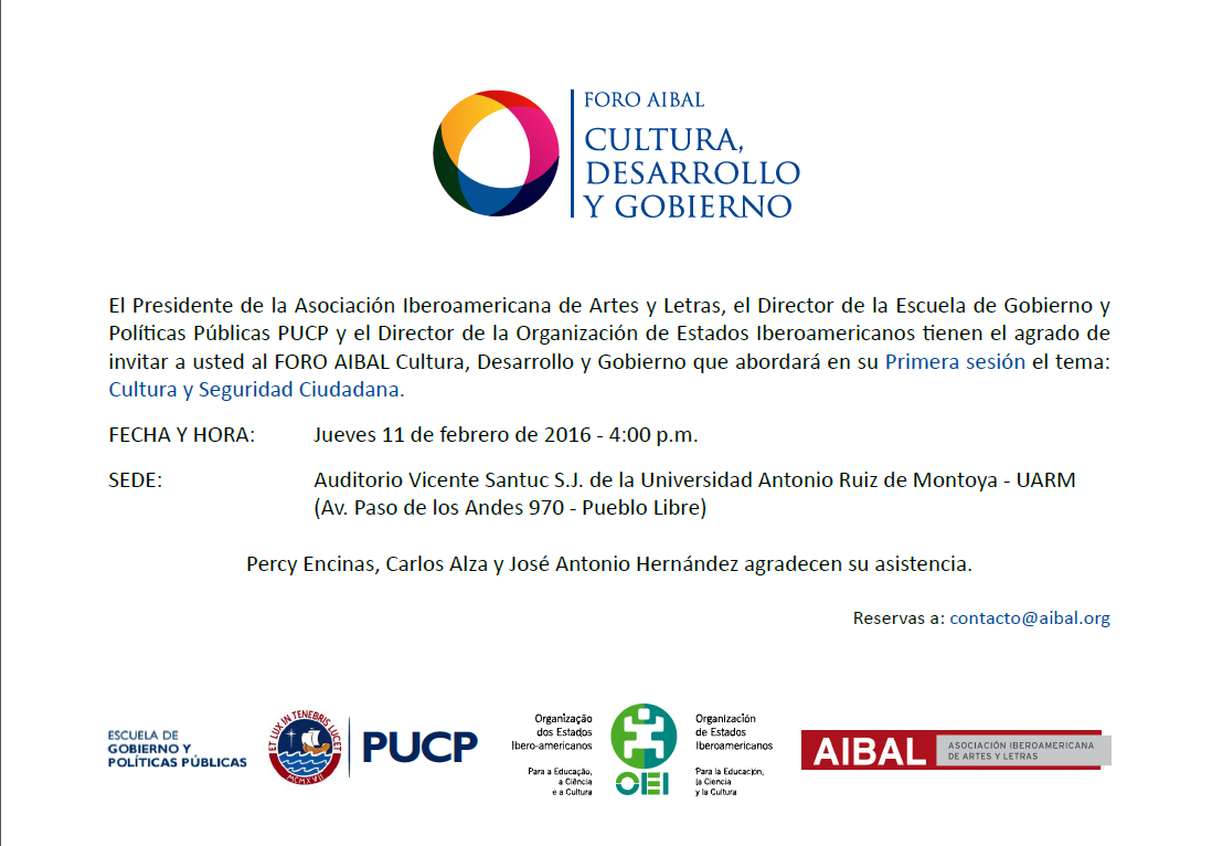 Con el fin de reflexionar sobre la importancia de la cultura y sus posibilidades de contribuir al desarrollo, la Asociación Iberoamericana de Artes y Letras (AIBAL), la Escuela de Gobierno y Políticas Públicas de la PUCP y la Organización de Estados Iberoamericanos (OEI), presentarán el Foro: Cultura, Desarrollo y Gobierno que inicia este jueves 11 de febrero de 2016 a las 4:00 pm en el Auditorio Vicente Santuc de la Universidad Antonio Ruiz de Montoya.