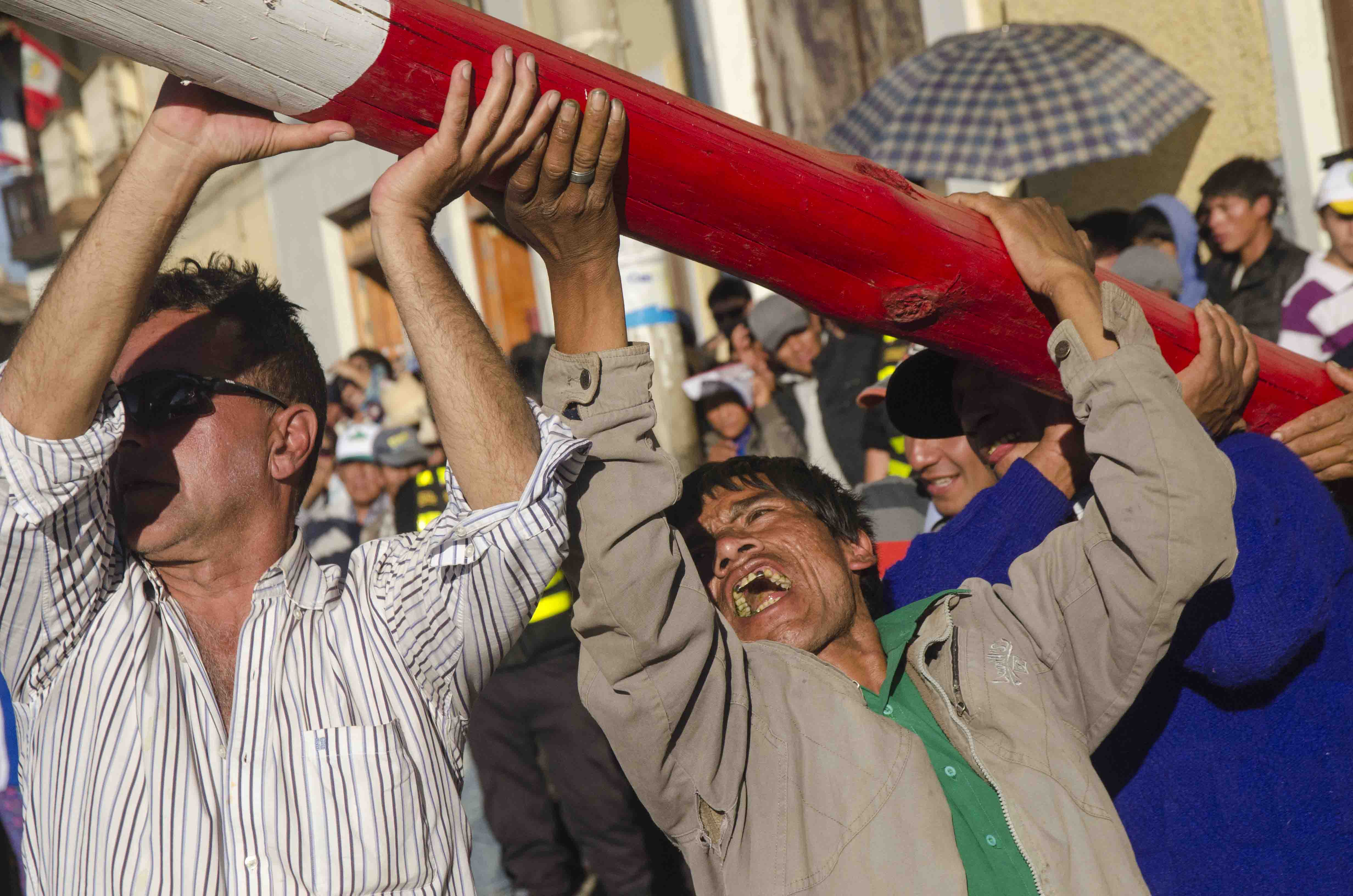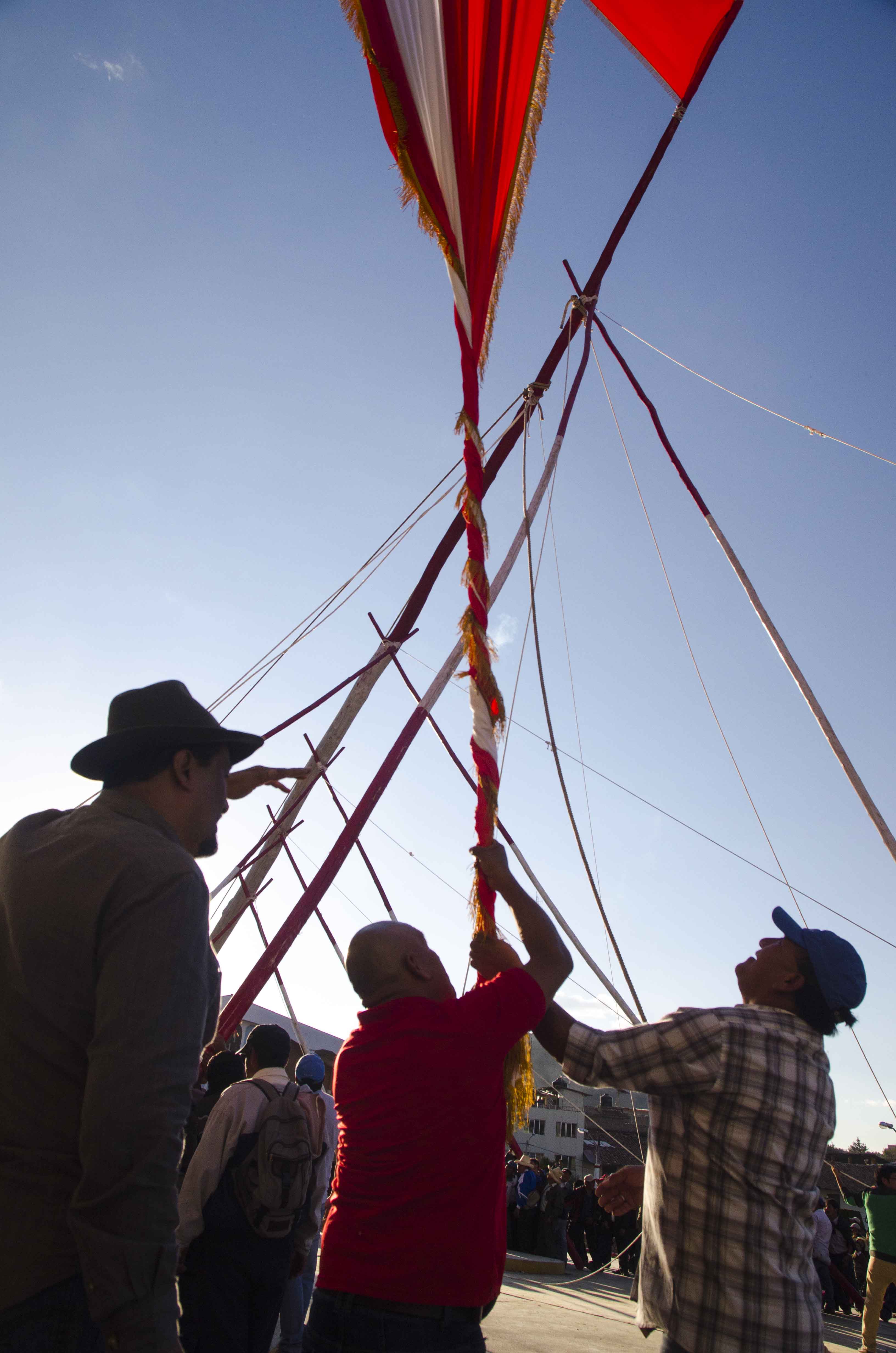 Foto 4: La técnica- Las tijeras conforman el primer y mayor impulso de este proceso, después el tronco es jalado con sogas para completar su posición vertical | | Foto 5: El cielo y la tierra- Las sogas también se encargan de enderezar al gallardete, creando correteos en la plaza, buscando el ángulo ideal para ellos | |