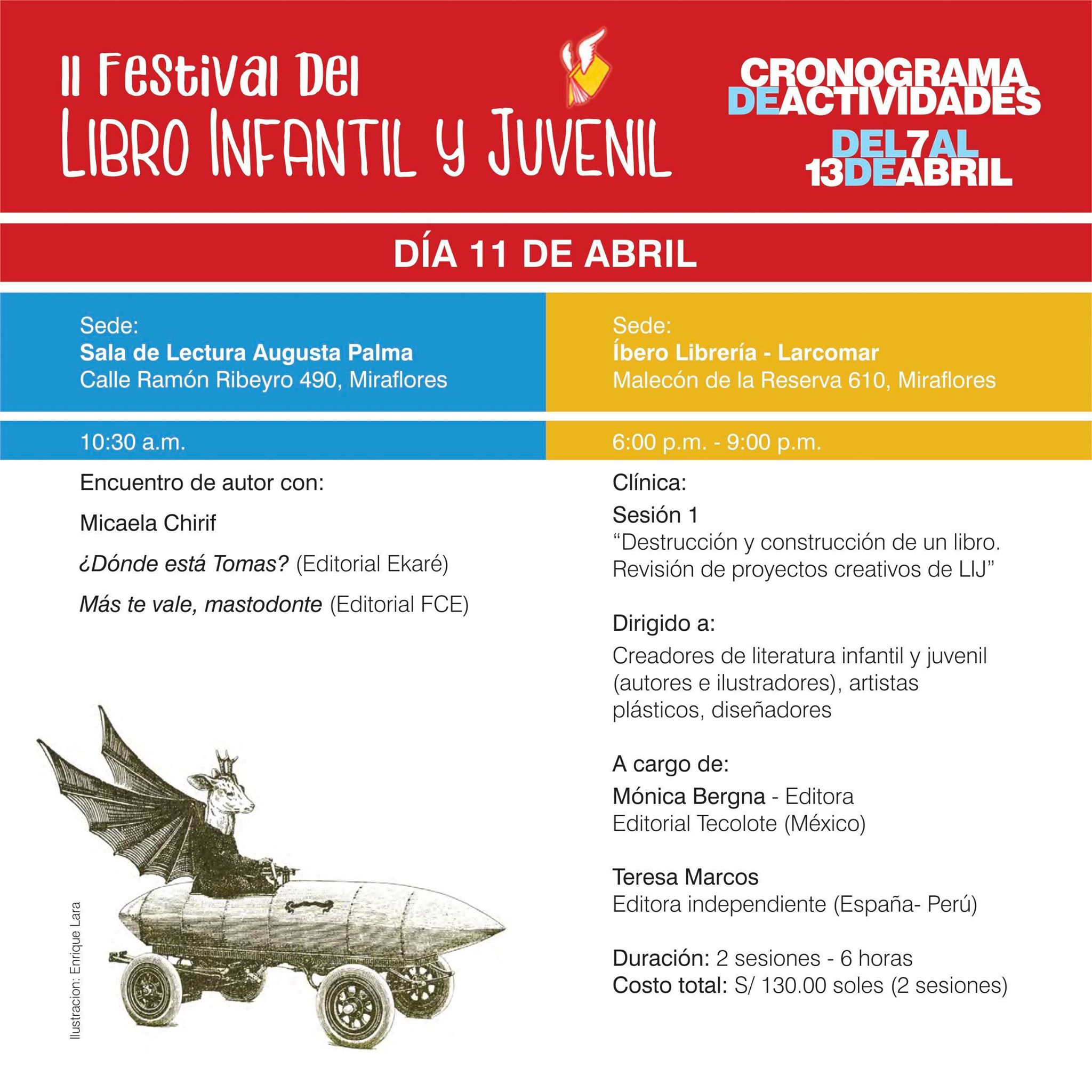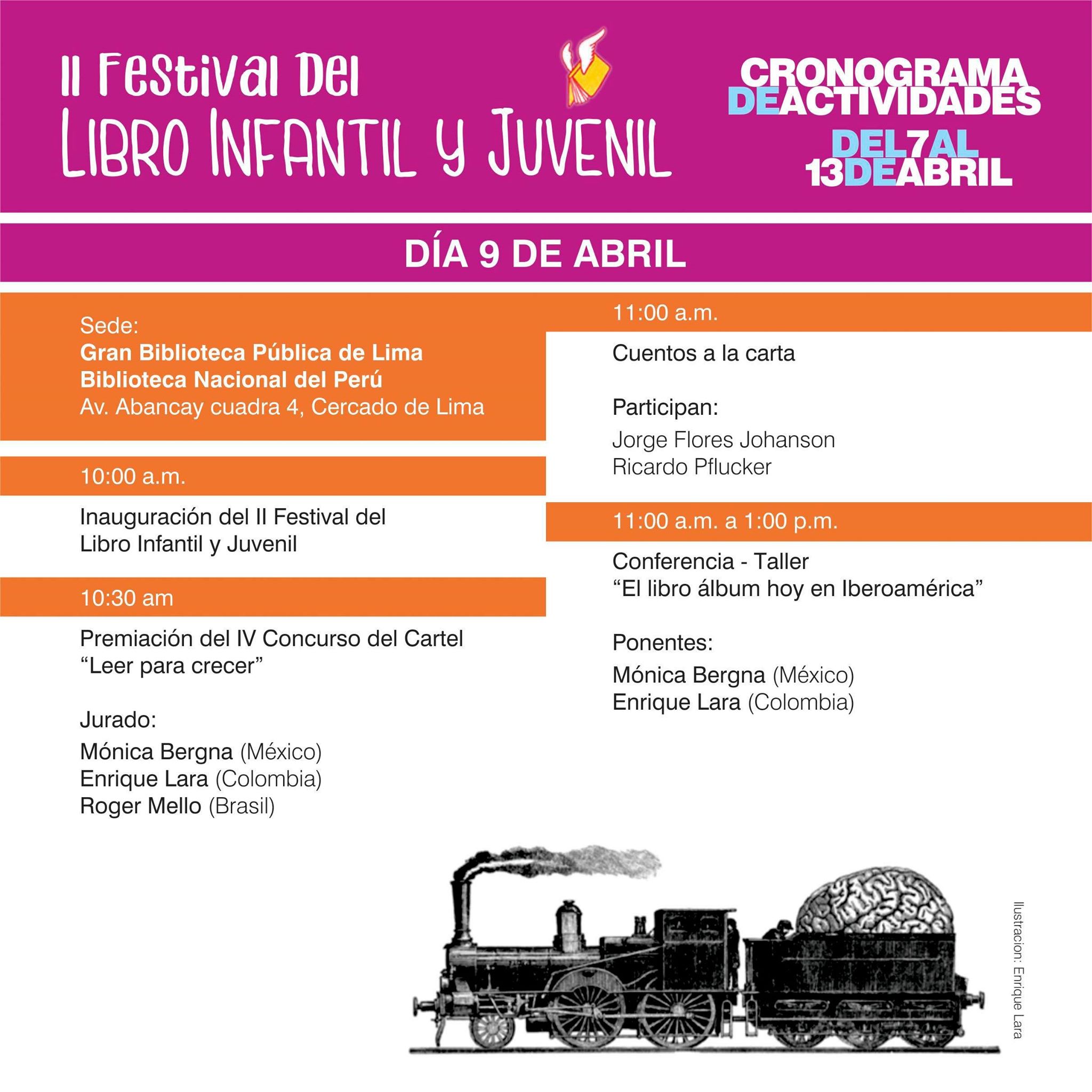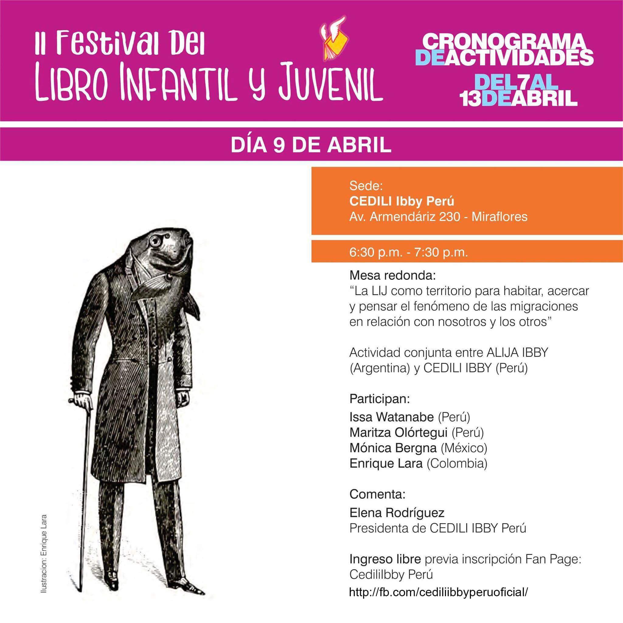 En el marco del Día Mundial del Libro Infantil y Juvenil, del 9 al 13 de abril, el Centro de Documentación e Información de Literatura Infantil (Cedili Ibby Perú), realizará el II Festival del Libro Infantil y Juvenil, evento que cuenta con la participación de destacados editores, escritores, ilustradores internacionales y nacionales, quienes ofrecerán talleres, mesas de diálogo, entre otras actividades diversos puntos de la ciudad de Lima.