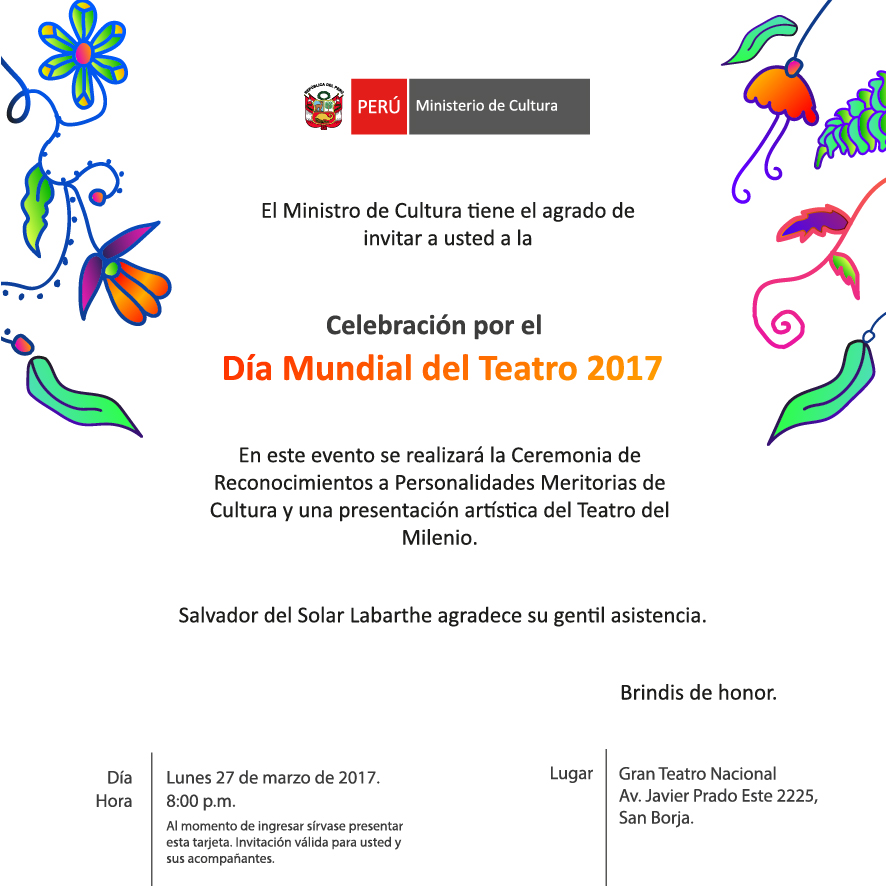 Ceremonia Pública de Reconocimientos a Personalidades Meritorias de la Cultura por el Día Mundial del Teatro 2017. El lunes 27 de marzo a las 8pm en el Gran Teatro Nacional.