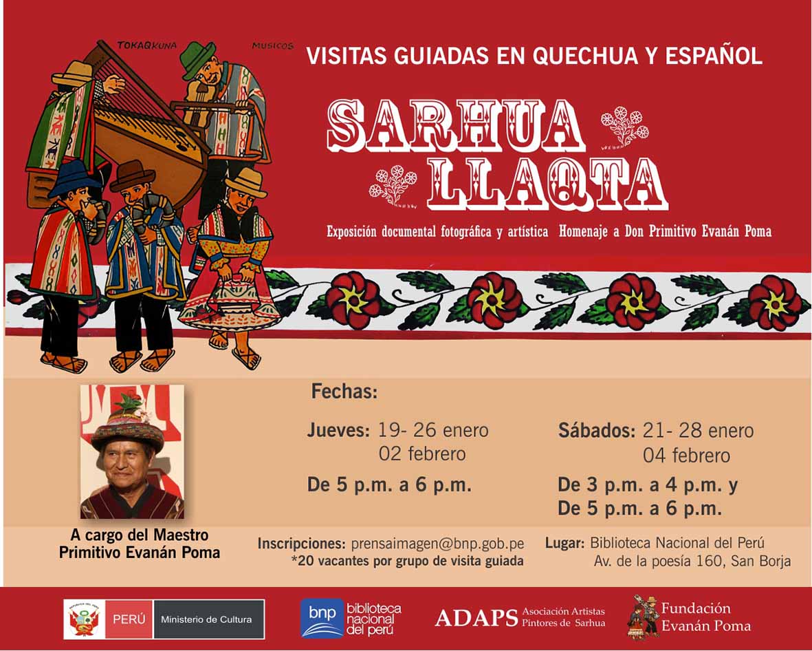La Biblioteca Nacional del Perú viene presentando en su Sala de Exposiciones la muestra documental, fotográfica y artística “Sarhua Llaqta: Homenaje a don Primitivo Evanán Poma”, que constituye un merecido homenaje para un artista que a lo largo de su vida ha difundido la cultura de su comunidad natal.