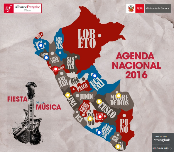Gracias a una articulación entre las Alianzas Francesas, el Ministerio de Cultura, a través de las Direcciones Desconcentradas de Cultura, y los colectivos pertenecientes a la Red Sonar, Zumo Colaboratorio y PenZion Producciones, se han programado conciertos con bandas locales en Cusco y Trujillo. Además, como parte del Calendario de las Artes 2016, impulsado por el Ministerio de Cultura, se realizarán conciertos gratuitos en Apurímac, Arequipa, Ayacucho, Chiclayo, Cusco, Iquitos, Lambayeque, La Libertad, Madre de Dios, Piura, Tacna y Ucayali.