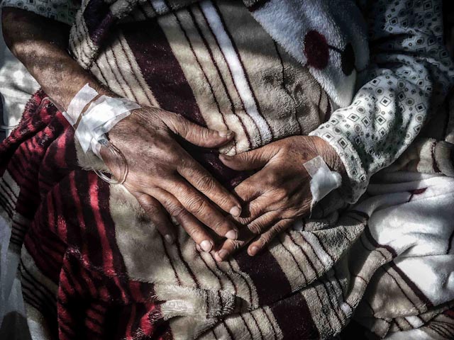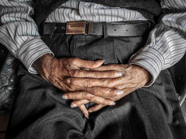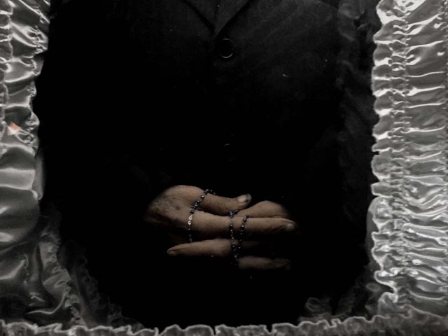 Foto 1. Vida (2015) El abuelo siempre solía sentarse los domingos en el mismo lugar de la casa, a ver la calle y leer el periódico, el tenía la costumbre de cruzar sus manos y descansar por las tardes ahí. Esta fotografía es de un domingo por la tarde, cuando lo encontré descansando tranquilo, mientras nosotros, los nietos, reíamos en la sala | | Foto 2. Enfermedad (2015) después de varias semanas, el abuelo ya no tenía fuerzas para ir al mismo lugar a sentarse a ver la calle y leer el periódico, ya hace algunos días que estaba postrado en su cuarto, con vías por donde pasaba el suero que lo mantenía hidratado. Un domingo por la tarde, lo encontré intentando cruzar sus manos, una costumbre que siempre tenía al descansar | | Foto 3- Muerte (2015) Un miércoles por la mañana, recibí la llamada de mi madre, el abuelo había muerto. Fui a verlo y lo encontré rodeado de flores blancas, con las manos cruzadas como de costumbre, en ellas tenía un rosario, su rostro tenía la pasividad de los domingos por las tardes, cuando lo encontraba descansando, luego de haber visto la calle y leído el periódico | |