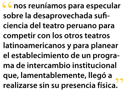 Al referirnos al teatro peruano, siempre debe hablarse de vinculaciones iniciales en diversas etapas, diversos modos y diferentes objetivos. Nacido en Lima, a solo unas cuadras de La Cabaña, mi primer contacto con el teatro peruano empezó cuando la Escuela Nacional Superior de Arte Dramático abrió sus puertas en 1956 y la Concha Acústica del Campo de Marte iniciará sus temporadas teatrales bajo la dirección de Luis Alvárez y Felipe Montoro. Era un pequeño espectador impresionado (hasta hoy) por las puestas de Collacocha de Enrique Solari Swayne, y La persecución y asesinato de Jean-Paul Marat representada por el grupo teatral de la casa de salud mental de Charenton bajo la dirección del Marqués de Sade de Peter Weiss. Años después, Hudson Valdivia se haría mi mentor teatral --fundando un club de teatro en el Emilia R. de Nosiglia-- mientras que Pablo Macera nos enseñaría en las aulas a ser más peruanos, deconstruyendo el eurocentrismo cultural que por entonces agobiaba a los intelectuales de mi generación. Mis años en la Universidad de San Marcos (1963-1968) serían absorbidos por la literatura (Augusto Tamayo Vargas), el teatro (Guillermo Ugarte Chamorro) y la psicología clínica (Reynaldo Alarcón), disciplinas que continuaría estudiando por cuatro años más en la Universidad de Texas (Austin) hasta que en 1972 me trasladaría en definitiva a la Escuela de posgrado en literatura, discurso y teatro iberoamericanos, emprendiendo una segunda etapa didáctica destinada a la obtención de una maestría y un Doctorado (Ph.D.) en la Universidad de Minnesota.