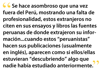 En lo que respecta a las dificultades propias de la investigación teatral, han habido sin duda algunos imponderables que dificultaron mi tarea en el Perú y que parecerían minúsculos si no fuera porque provenían de los mismos peruanos o de extranjeros de paso por el Perú. Por ejemplo, la suspicacia de siempre hacía que muchos archivos y materiales teatrales fueran inaccesibles a los investigadores nacionales ya sea porque se pensaba que uno se iba a aprovechar financieramente de los mismos o porque simplemente uno no estaba en el circuito socio-político correspondiente, v.gr. nunca tuve relaciones de trabajo con los teatros comerciales, ni con los de la burguesía peruana, ni nunca fui invitado por ellos. Paradójicamente los investigadores extranjeros (los relacionados con la academia) encuentran arca abierta y ninguna dificultad para organizar archivos y fabricar dossiers utilizados para lograr mejoras monetarias y reconocimiento académico en sus países de origen. Se hace asombroso que una vez fuera del Perú, mostrando una falta de profesionalidad, estos extranjeros no citen en sus ensayos y libros las fuentes peruanas de donde extrajeron su información, no se ven acotaciones de la introducción que escribí a Notas sobre teatro entre varios “especialistas extranjeros del teatro peruano.” Esto es insólito si tomamos en cuenta que ese libro se discute en la academia teatral y que recibió notables reseñas internacionales desde el 2001 cuando se publicó. Cuando estos “peruanistas” hacen sus publicaciones (usualmente en inglés), aparecen como si ellos/ellas estuvieran “descubriendo” algo que nadie había estudiado anteriormente: nadie los llama al orden, de forma que algunos continúan en la práctica. Otra dificultad reside en la sistemática desaparición de festivales, materia prima de la investigación teatral; todos nos extrañamos cuando Percy Encinas, destacado investigador y promotor teatral limeño, dejara de organizar sus grandes festivales teatrales de la UCSUR, y fuera reemplazado por una extranjera cuya capacidad de convocación teatral era relativamente menor. En mi caso particular, aunque indirectos, estos cambios repentinos hicieron más difícil la investigación, puesto que disminuyeron las posibilidades de representación escénica y el contacto con los grupos peruanos de la periferia.
