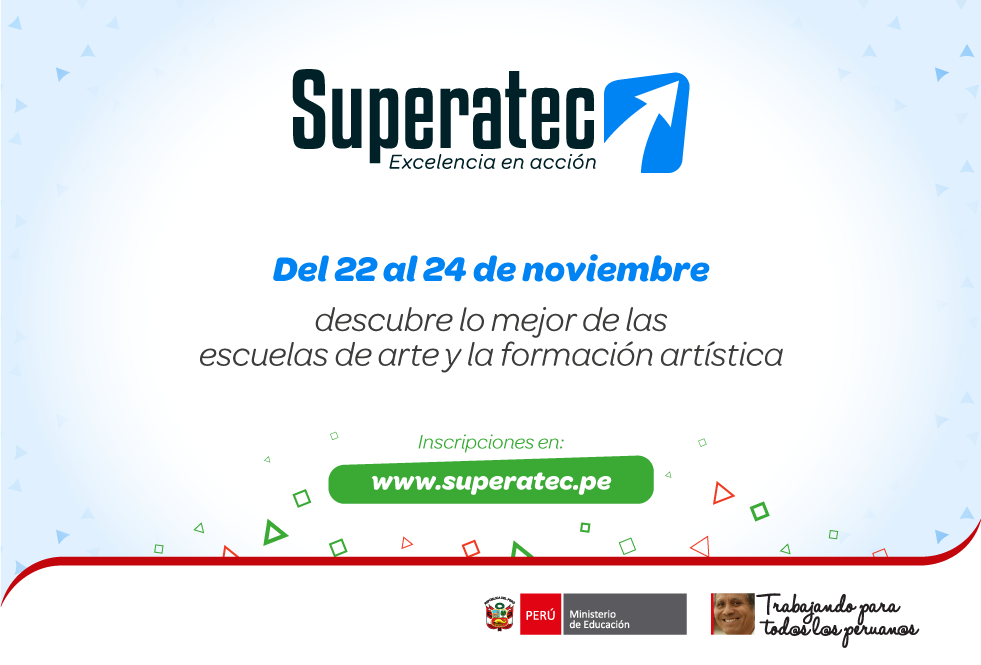 El Ministerio de Educación te invita a participar en el encuentro nacional denominado Superatec, excelencia en acción; un evento que reunirá, durante tres días , a lo mejor y más destacado de la educación técnico-productiva y superior tecnológica y artística. Las actividades relacionadas a la educación superior artística se llevarán a cabo el jueves 23 de noviembre a partir de las 10:00 a.m. Del 22 al 24 de noviembre en el Instituto Araoz Pinto ubicado entre las avenidas Faucett y La Marina en el distrito de San Miguel. Ingreso libre previa inscripción: www.superatec.pe