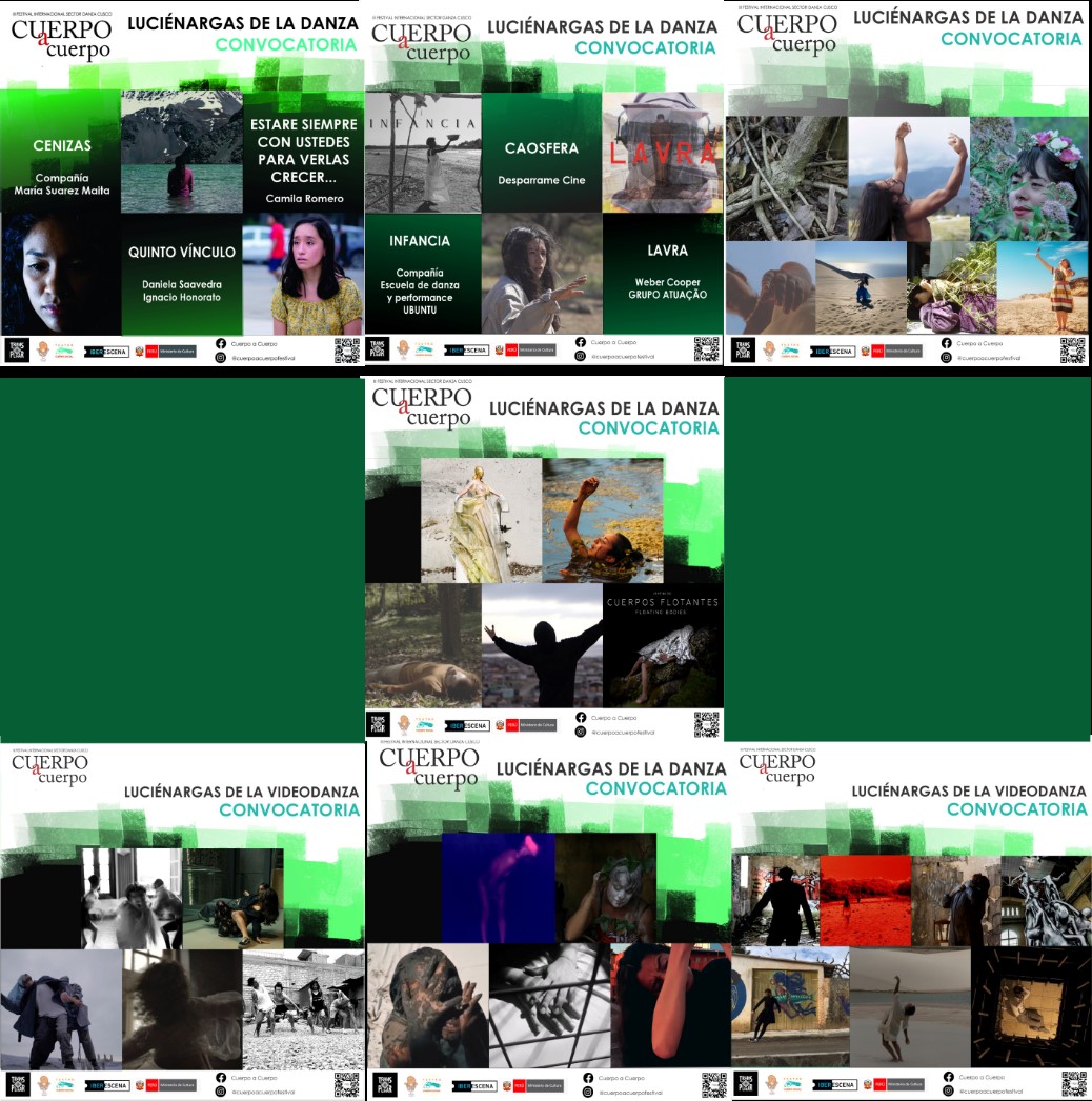 En esta edición realicé las funciones relacionadas con la línea gráfica y las exigencias de las necesidades técnicas de los medios virtuales. Mi trabajo consistió en ocuparme, de esta manera, de la producción de carteles para redes sociales y de las publicaciones de los artículos de la Muestra: Luciérnagas de la Videodanza, que fueron seleccionados por la curaduría. Esta Muestra estuvo compuesta por trabajos de artistas invitados y convocados (en esta categoría se recibió 111 propuestas de videodanza a través de nuestra convocatoria de carácter ibero americana). Luciérnagas de la Videodanza estuvo compuesta por un total de 40 obras, 6 de las cuales fueron de artistas previamente invitados por la dirección y otras 34 obras seleccionadas por los curadores, Charlotte Giusti (Francia), Augusto Navarro (Perú) y Flavio Tonnetti (Brasil), bajo la curaduría general de Carlos Cruz (México). Estas creaciones se exhibieron durante los siete días del festival y aún lucen en las plataformas digitales del Cuerpo a Cuerpo[2].