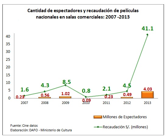 Es necesario mencionar que en el análisis del comportamiento evolutivo del cine nacional respecto a la recaudación y el número de espectadores que atrajo, los niveles alcanzados durante el año 2013 constituyen un caso sui generis por la presencia de estas dos mencionadas películas con altos niveles de vínculo con el público asistente a las salas de cine comercial. Por tanto, si para efectos de analizar la tendencia en el desarrollo del cine nacional en tanto recaudación y espectadores, es necesario observar con detenimiento su comportamiento durante el período 2007-2012, en ese período, el sector ha mostrado crecimientos significativos, siendo en el año 2009 el de mayor crecimiento en 8, 5 millones de nuevos soles y un millón de espectadores, a pesar de la crisis económica internacional, para el año 2010 la demanda se contrajo cayendo la cantidad de espectadores en -91.2% y la recaudación en -90.3% respecto al año anterior.