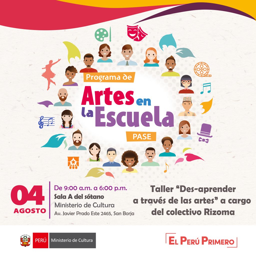 El Ministerio de Cultura, a través de la Dirección de Artes organiza un nueva jornada de capacitación de PASE (Programa de Artes en la Escuela) el sábado 04 de agosto de 2018 en las instalaciones de la sede central del Ministerio de Cultura (Av. Javier Prado Este 2465, San Borja).