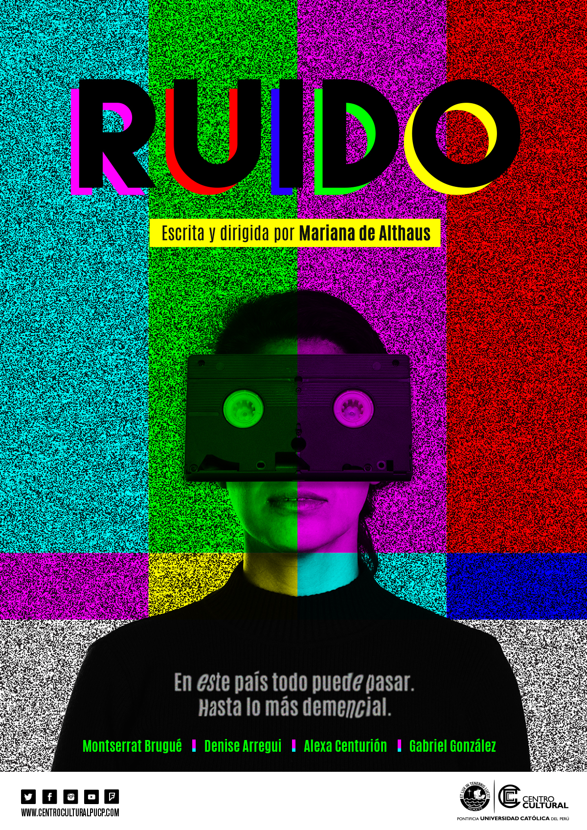 El Centro Cultural de la Pontificia Universidad Católica del Perú se complace en presentar la obra RUIDO, escrita y dirigida por Mariana de Althaus. Una comedia ambientada a fines de los ochentas en el Perú que confluye entre lo real y lo absurdo, conformada por un gran elenco: Denise Arregui, Montserrat Brugué, Alexa Centurión y Gabriel González. Desde el jueves 10 de marzo en el Teatro CCPUCP.
