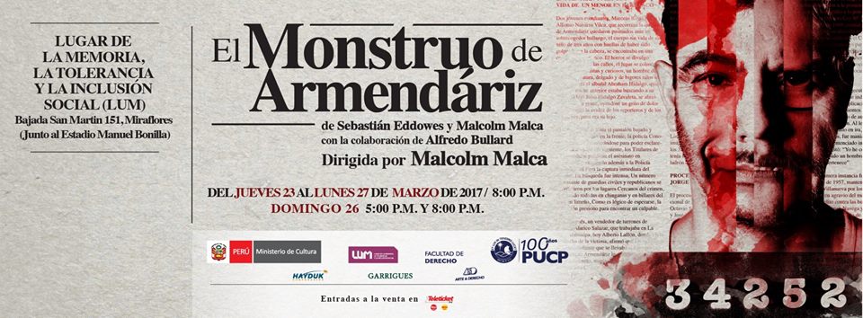 La Facultad de Derecho de la Pontificia Universidad Católica del Perú y el Lugar de la Memoria del Ministerio de Cultura presentan la obra "El monstruo de Armendáriz", en una corta temporada del 23 al 27 de marzo a las 8:00 p.m. (domingo 26 en doble función a las 5 p.m. y 8 p.m.) en el Auditorio LUM (Bajada San Martín 151, Miraflores).