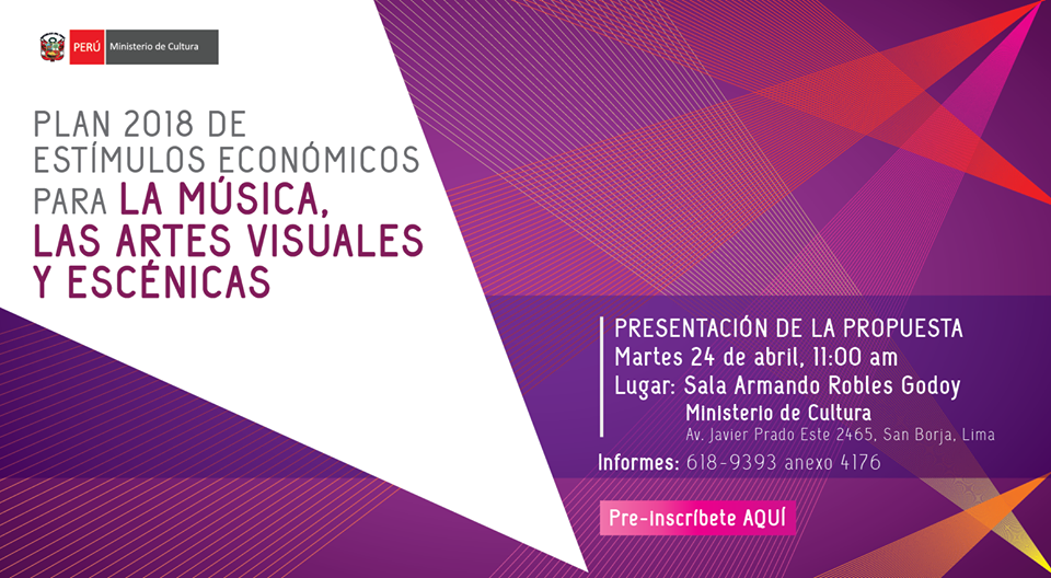 El Ministerio de Cultura presentará públicamente propuesta de estímulos económicos para las Artes Escénicas, Visuales y la Música este martes 24 de abril, 11am. Pre-inscripción: https://goo.gl/buEFDm