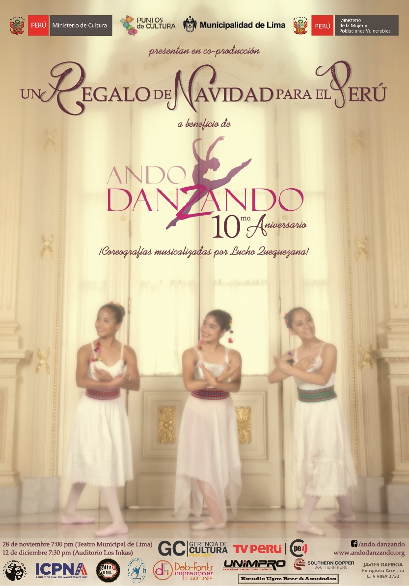 La Asociación Cultural Andodanzando Voluntariado, en co-producción con la Municipalidad Metropolitana de Lima y con el apoyo del Ministerio de Cultura, nos invita a la presentación de ‘‘UN REGALO DE NAVIDAD PARA EL PERÚ", con motivo de sus diez años de trabajo ininterrumpido. Las coreografías estarán musicalizadas por el compositor peruano Lucho Quequezana.
