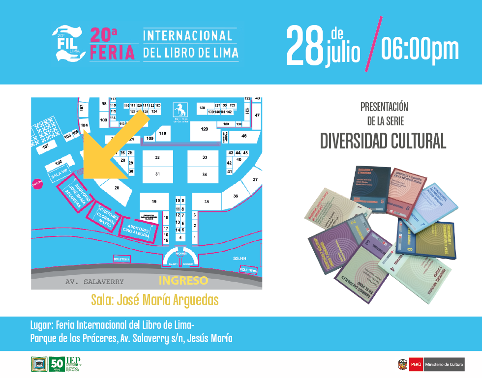 El Ministerio de Cultura celebrará un aniversario más de nuestra independencia presentando la Serie Diversidad Cultural en la FIL de Lima 2015. El evento se realizará el 28 de julio en la Sala José María Arguedas a las 6:00 p.m. Se entregará la serie a los primeros 20 estudiantes que asistan a la Sala José María Arguedas presentando su carné universitario.