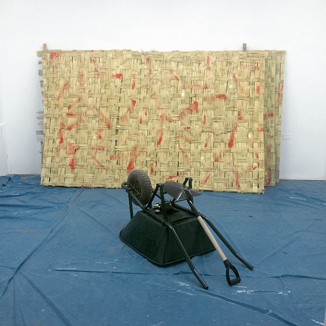 La respuesta de Sikic ante esta impasible inercia es traer el arenal a la galería. En un gesto evocador de las tomas de tierra, Sikic toma posesión del depurado interior de la galería y lo transforma en desierto limeño. En este crudo suelo, en solemne silencio, erige su choza de esteras, la nombra con sus apellidos y reposa por una simbólica noche.
