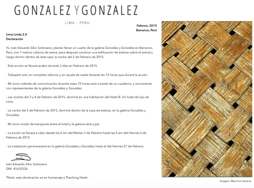El desarrollo de la obra artística de Iván Sikic se inició la mañana del martes 3 de febrero con el llenando de arena, pala a pala, de un cuarto de la Galería Gonzalez y Gonzalez. Iván no recibirá ayuda de nadie y no hablará durante ese tiempo. Pasará las noches en un hotel de lujo. Luego de instalada toda la arena, Iván armará con las esteras una choza, y pasará la noche ahí. La instalación quedará abierta hasta el 27 de febrero de 2015. El siguiente texto es de Jorge López Canales a propósito de "Lima Linda 2.0" del artista Iván Sikic.