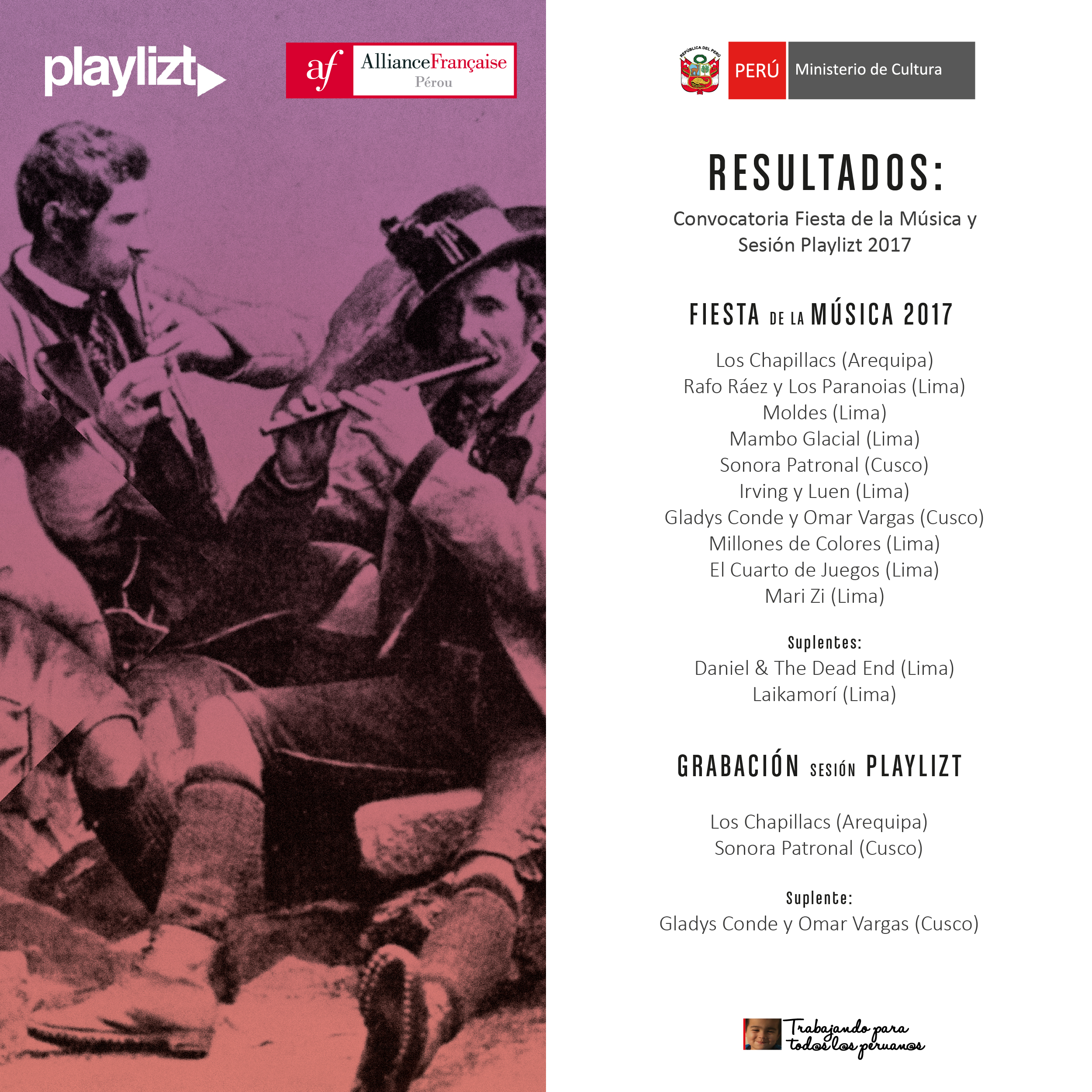 El Ministerio de Cultura a través de su Dirección de Artes, agradece la participación de cada uno de los grupos de música participantes de la Convocatoria Fiesta de la Música y Sesión Playlizt 2017; y anuncia los resultados: