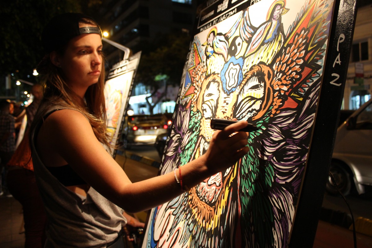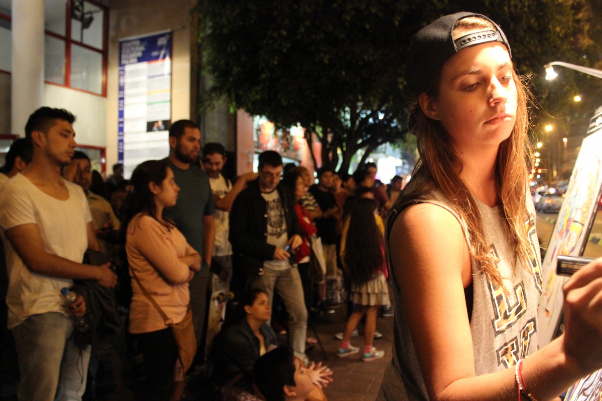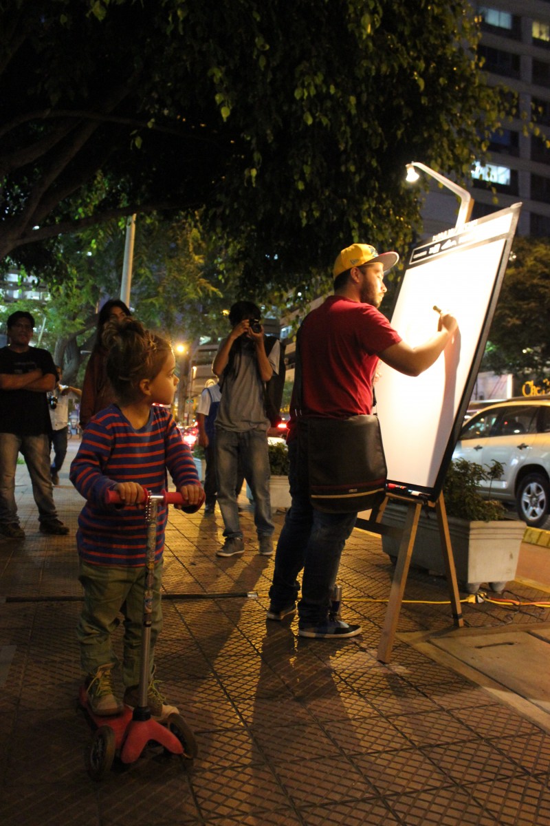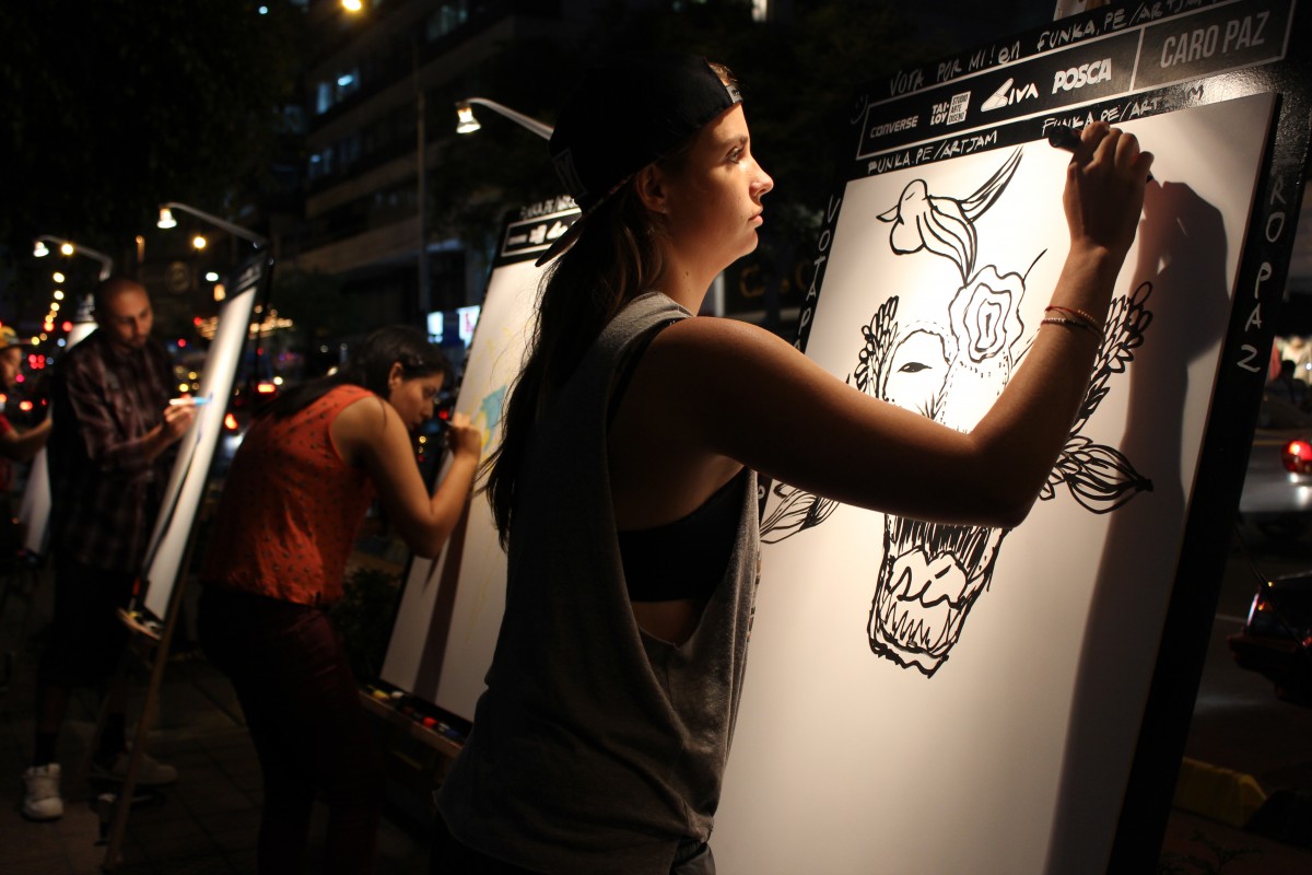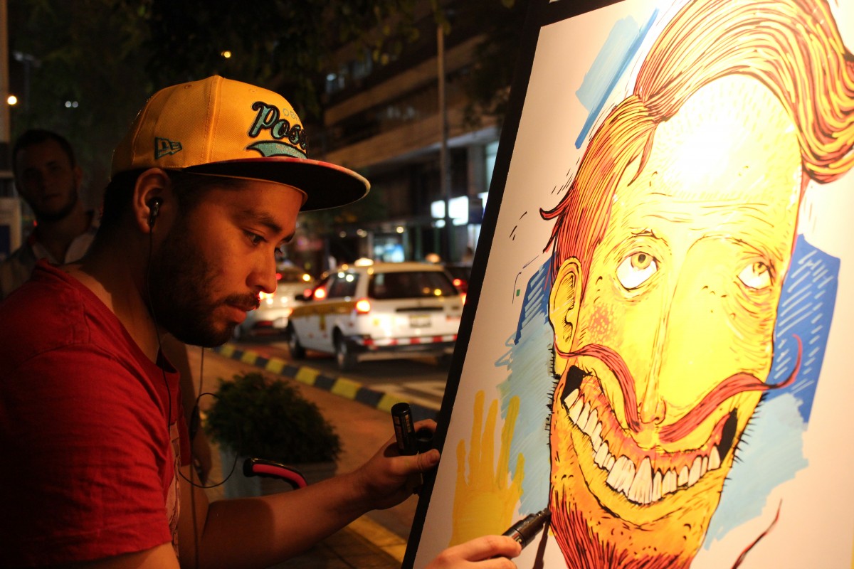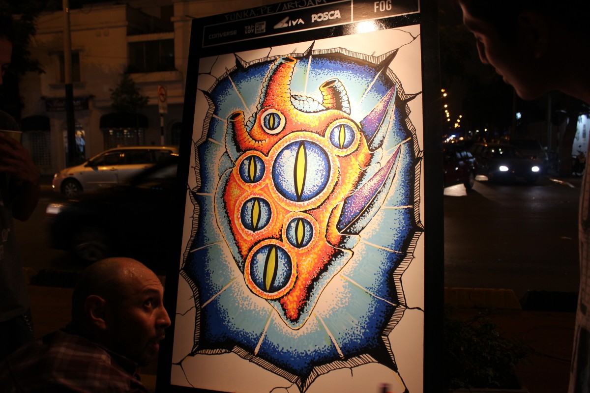 At 5 on Friday, Abril 17, onlookers watched as the sidewalk of outside of CC Ricardo Palma transformed into an art studio. Usually a private space, six urban artists invited all of Lima into their artistic processes. Of course, these urban artists are more accustomed to the street than your average painter, their canvases being construction walls late at night. Art Jam, however, put a spotlight on these stelth artists in order to celebrate them. Friends, family, art fiends, and curious foreigners all gathered around to watch the spectacle take place in front of them.