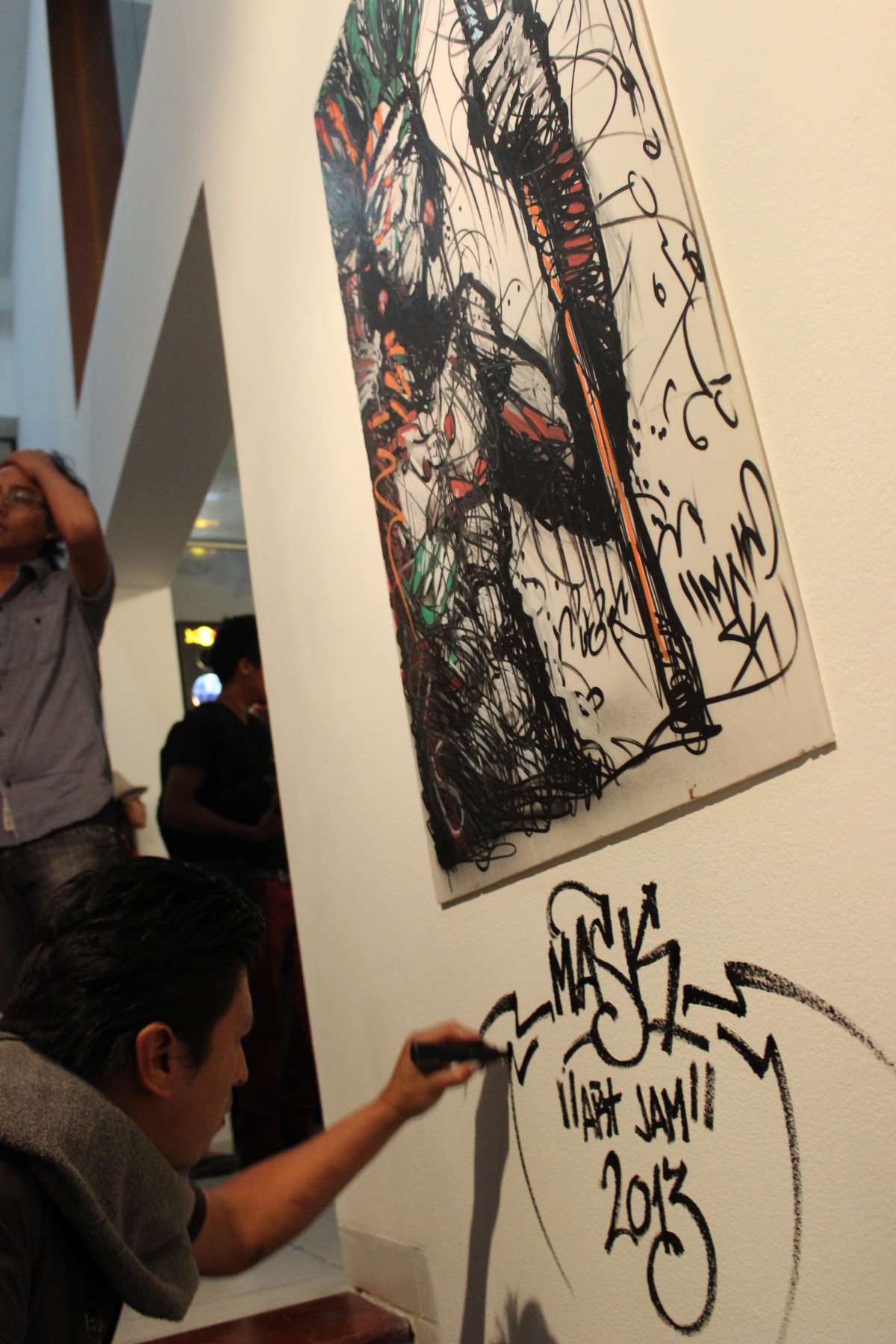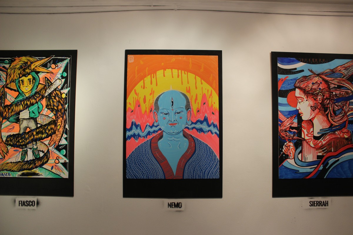 At around six, the art of setting up the canvases, lights and art supplies was over, and the artists were all given the same colored pens as they began their masterpiece. The artists had three hours to complete the task. They were to use their limited colored markers to make a masterpiece. In the corner of the canvas had an individualized bar code which you could scan on your smartphone to vote for your favorite. Once initial anticipation of the artists beginning their work, with the first scribbles on the canvas in one color, music began to blare from a speaker and free red bulls were handed out to the artists, as well as a few special guests. If one got bored of watching the artistic process, the basement of the cultural center was open to guests. The affiliated exhibition featured all the participants work from years past, which made the guests feel like they were becoming a part of history, the legacy that is Art Jam.