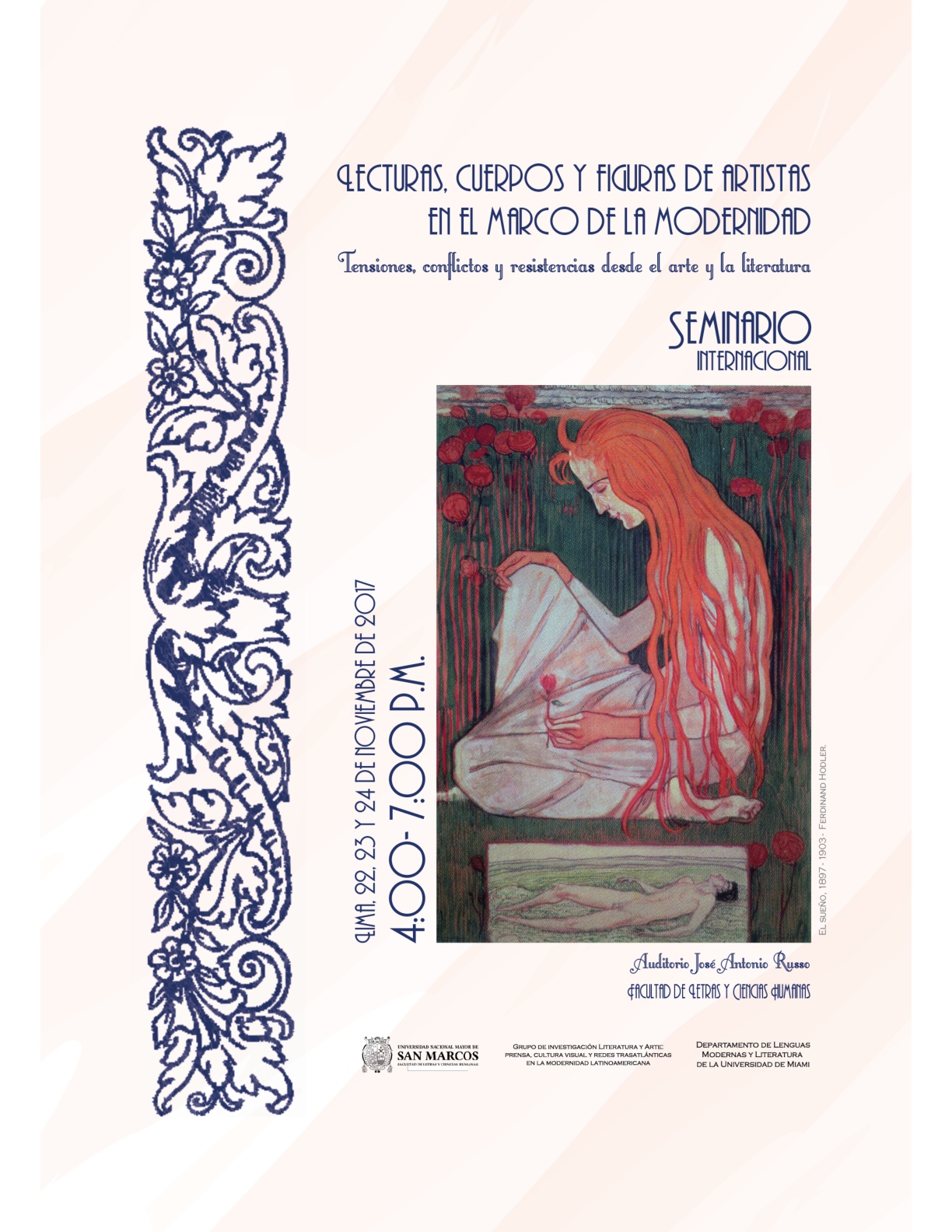 El Seminario internacional Lecturas, cuerpos y figuras de artista en el marco de la modernidad: tensiones, conflictos y resistencias desde el arte y la literatura, ha sido organizado por el grupo de investigación Literatura y Arte: prensa, cultura visual y redes trasatlánticas entre Europa y América Latina, integrado por profesores de la Universidad Nacional Mayor de San Marcos, la Universidad de Miami (Florida, Estados Unidos) y la Florida International University (Florida, Estados Unidos).