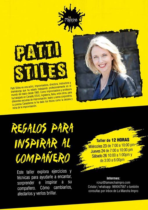 Patti Stiles, conocida como la madre de la improvisación,  llega por primera vez al Perú gracias a los integrantes de La Mancha Impro. Durante su estadía en nuestro país dictará el Taller Regalos para inspirar al compañero los días 23, 24 y 26 de septiembre. Se parte de esta experiencia,  las inscripciones están abiertas.