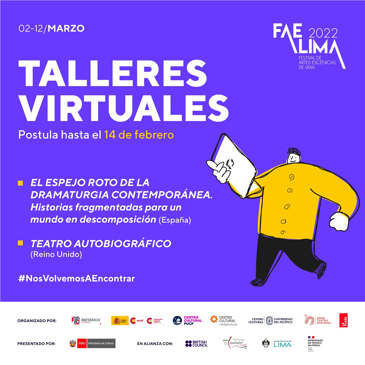 El Festival de Artes Escénicas de Lima 2022, presentado por el Ministerio de Cultura del Perú, lanza la convocatoria para 2 talleres virtuales.
