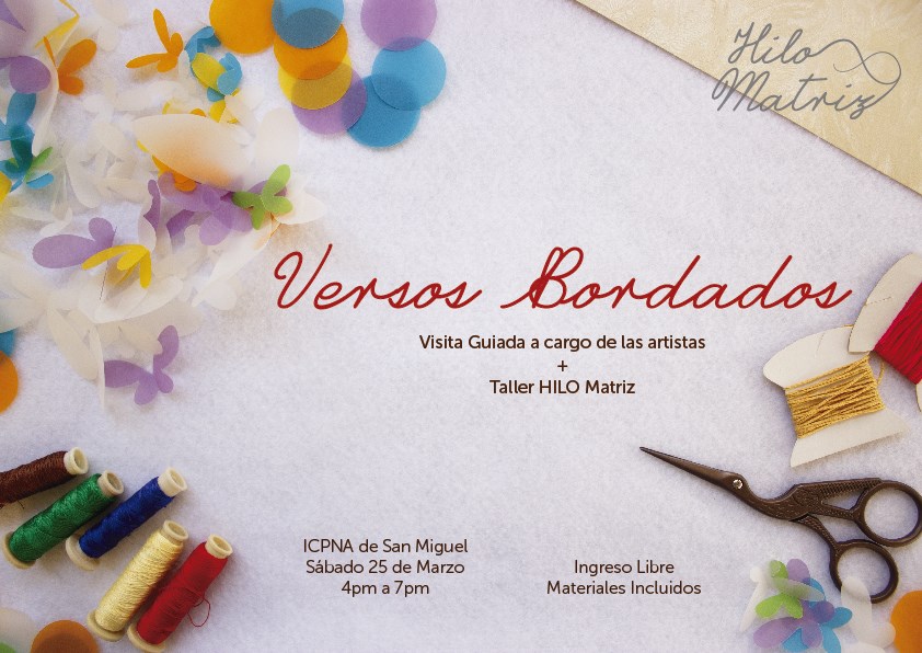 Este sábado 25 de marzo del presente año se llevará a cabo el taller gratuito de bordado ilustrado con una visita guiada a la exposición colectiva "Hilo Matriz" por las artistas María Arribasplata, Cristina Flores y Alicia Ugaz conversando sobre los universos ilustrados y crear en papel, tinta e hilos. Este evento culminará con el taller práctico "Versos Bordados" basado en la poesía como detonador para la creación de una ilustración en técnica mixta entre carboncillos, tintas e hilos bordados al papel.