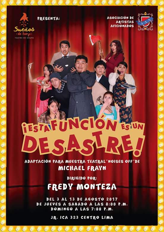 Sueños de Fuego - Teatro de Grupo presenta ¡Esta Función Es Un Desastre!, adaptación para muestra teatral de “Noises Off”. La temporada va del 3 al 13 de agosto los días jueves, viernes y sábado a las 8 p.m. y domingos a las 7 p.m. en el Teatro de la Asociación de Artistas Aficionados, Jr. Ica 323 - Centro Histórico de Lima. Entrada General 15 soles.