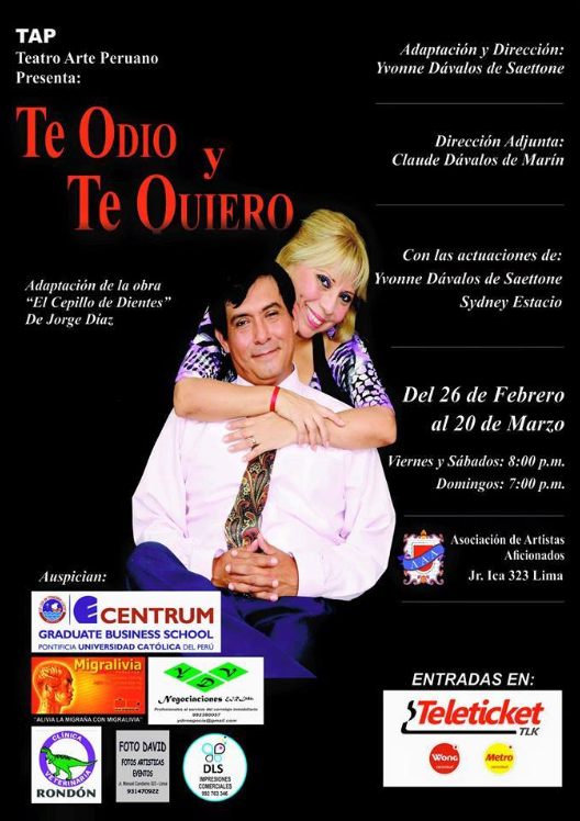 “Te odio y te quiero” es la obra que se presenta en la Asociación de Artistas Aficionados (AAA) y que nos cuenta la historia de una pareja de esposos que, cansados de la rutina, emprende una serie de juegos extraños de representación para afianzar su amor o desamor. La obra va los viernes y sábados a las 8:00 pm. y los domingos a las 7:00 pm. en el teatro de la Asociación de Artistas Aficionados (AAA), ubicado en el jirón Ica 323 – Centro Histórico de Lima. Las entradas están a la venta en Teleticket, en Atrapalo.com y en la boletería del teatro a 20 soles (General) y 15 soles (Estudiantes y jubilados).