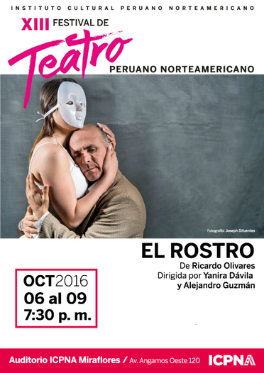 En el marco del XIII Festival de Teatro Peruano Norteamericano ICPNA 2016, desde el jueves 6 al domingo 9 de octubre se presentará la obra "El Rostro" de Ricardo Olivares en el Auditorio ICPNA Miraflores.