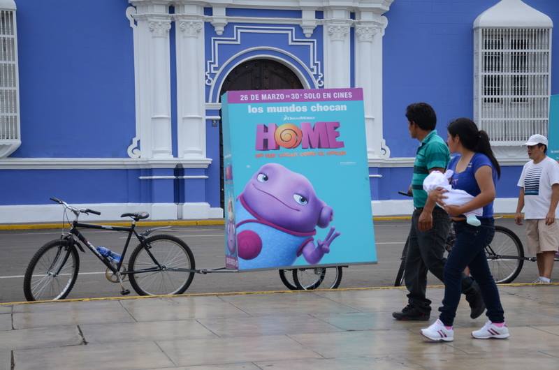 foto4.fotografiando los sueños(015) plaza de armas de trujillo/la sombra de un fotógrafo y un taxista durmiendo/un taxista se quedó dormido en su carro y un fotógrafo se acerca a retratarlo/ivan orbegoso cipra | | foto5.los mundos chocan,las culturas también(2015)plaza de armas de trujillo/una familia y un cartel publicitario/una familia oriunda pasa observando un cartel publicitario donde se lee que los mundos chocan/ivan orbegoso cipra | |