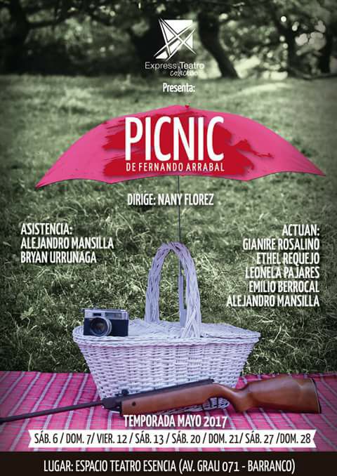 El pasado sábado 06 de mayo se estrenó la PRIMERA OBRA TEATRAL: PICNIC de Fernando Arrabal con la organización del Express Teatro Colectivo, buscando envolver y divertir al público, pero también removerlo e inducirlo a la reflexión. La temporada va del 06 al 28 de mayo en 8 únicas funciones en el Espacio Teatro Esencia, Barranco a las 8:00 p.m.